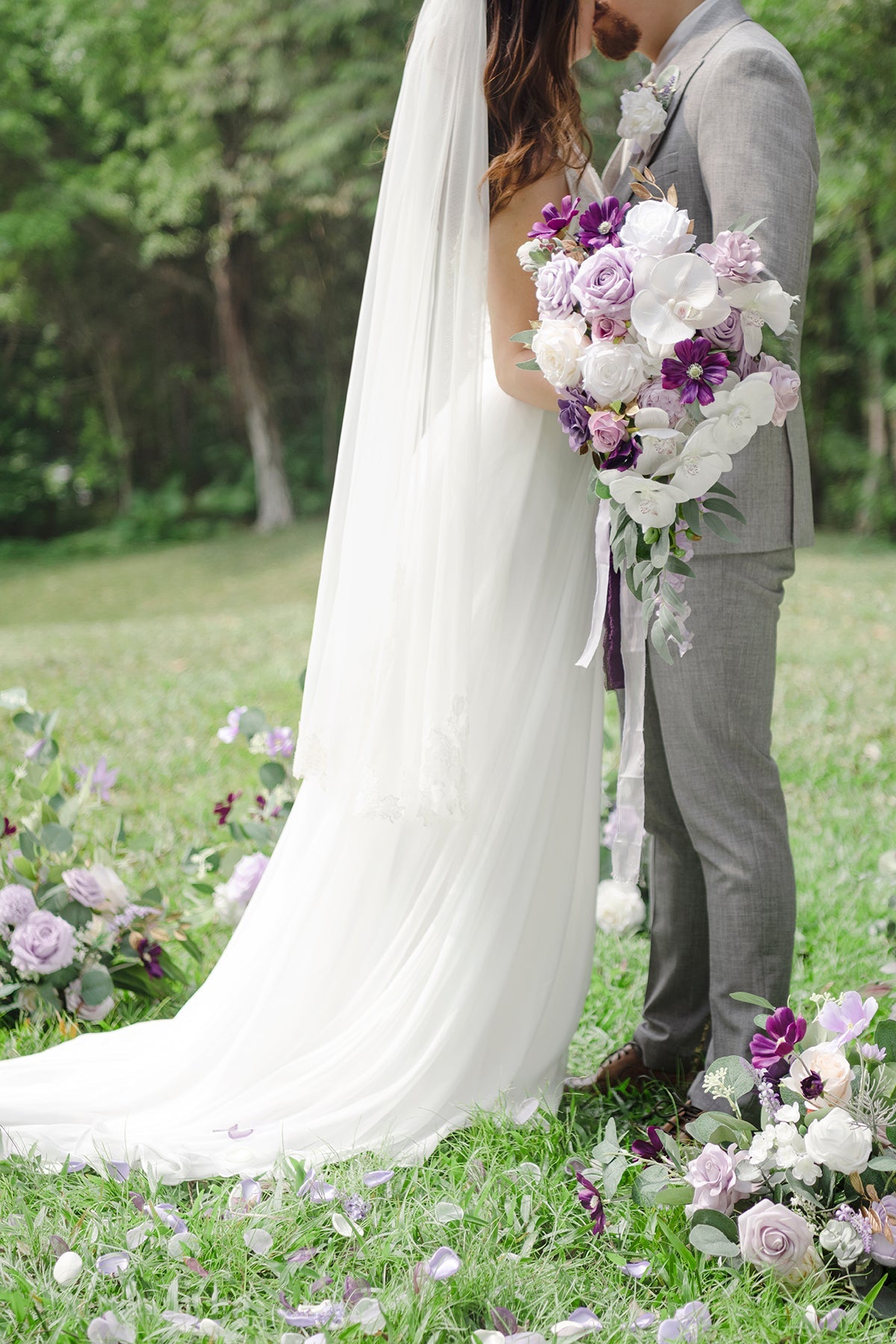 Package: Bridal bouquet x1 . approx. 11" wide by 20" tall (includes sagging greenery). 3.25ft lavender and plum chiffon ribbons. They are placed side by side on a card to keep the ribbon neat and tidy.