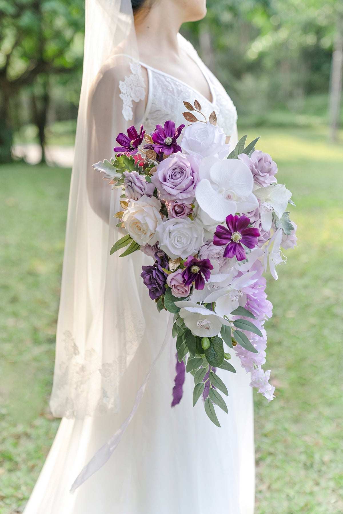 This exquisite cascading bouquet uses a variety of floral materials brought together in an elegant and smooth curved drop for a very artistic look. Phalaenopsis orchids . gardenias . pasque flowers . roses . old garden roses . Wisteria flowers . and eucalyptus leaves create a full sense of structure. A palette of lavender and cream . such a romantic and dreamy wedding color theme.