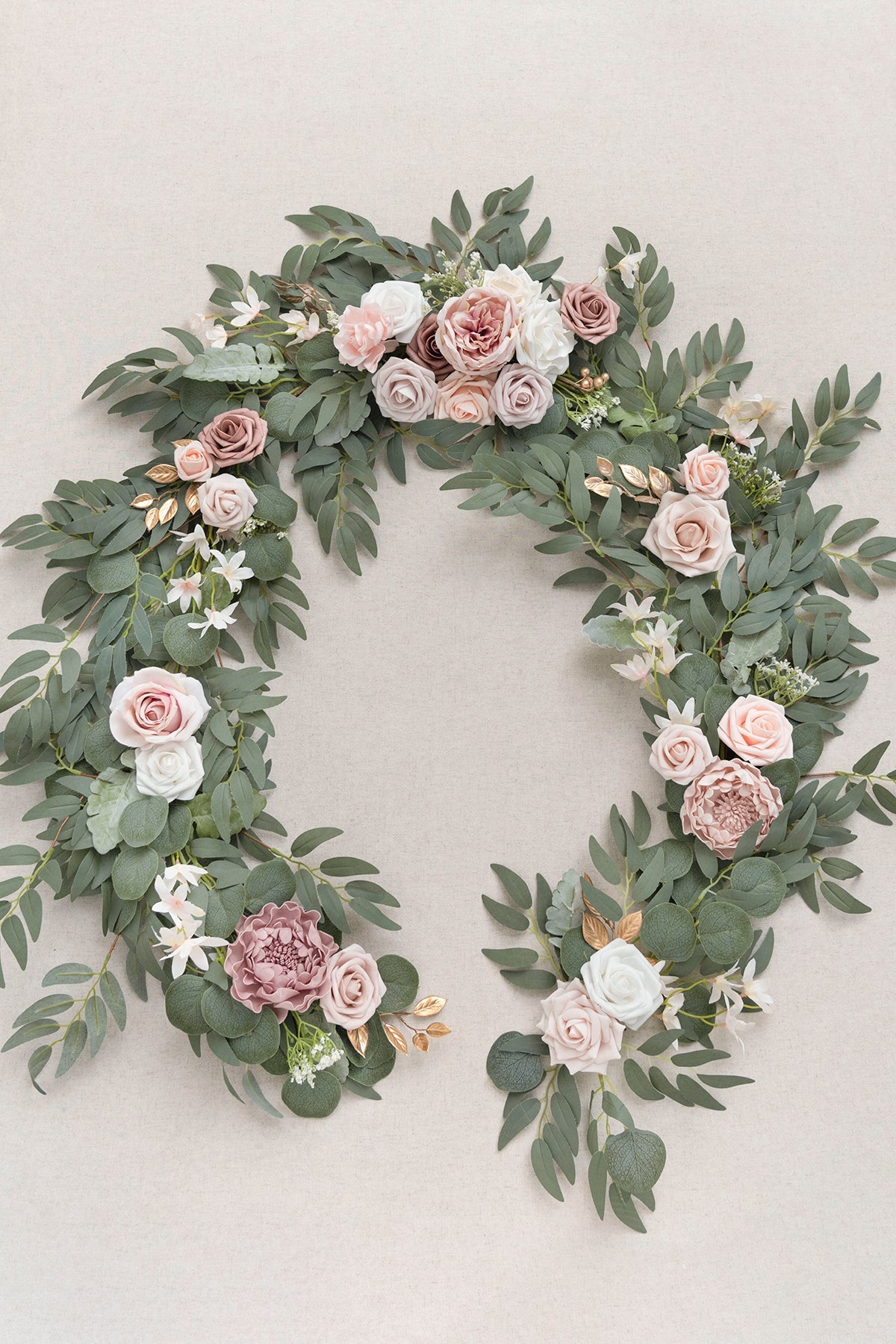 Handmade with real-looking foam and silk flowers . and dotted with moth orchids . gypsophila . and banyan leaf on a silk sage green greenery garland base . this gentle Dusty Rose & Cream flower garland is perfect for romantic spring/summer wedding decorations.