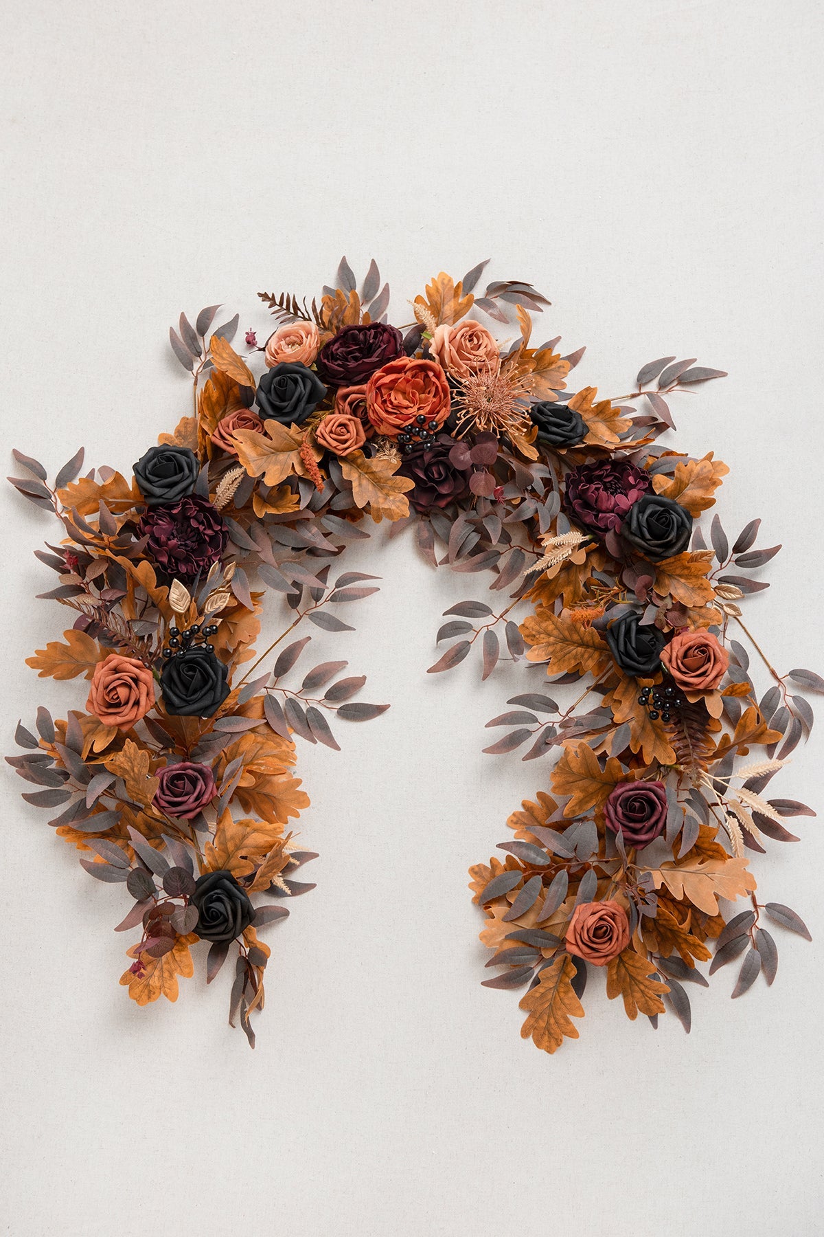 - Material: Handmade with silk/foam flowers and silk rose garland. On silk oak and willow leaf garlands base . burnt orange Austin rose as the main flower accented with spider mums . ranunculus asiaticus . Vendela rose . chorale rose . avalanche rose . Setaria grass . and gold bamboo leaf.