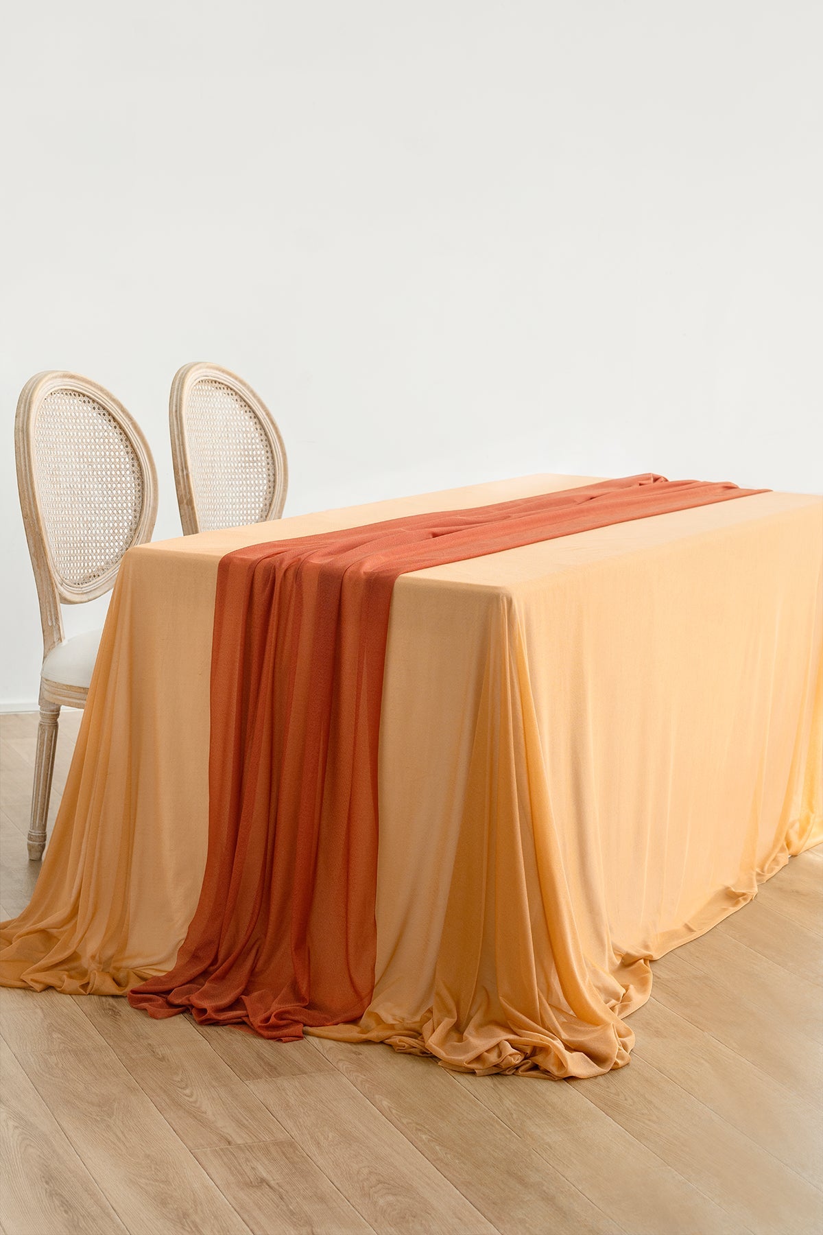 - Material: 100% polyester. The thermal cutting no seaming technique makes this sheer table runner more graceful than traditional fabrics.
