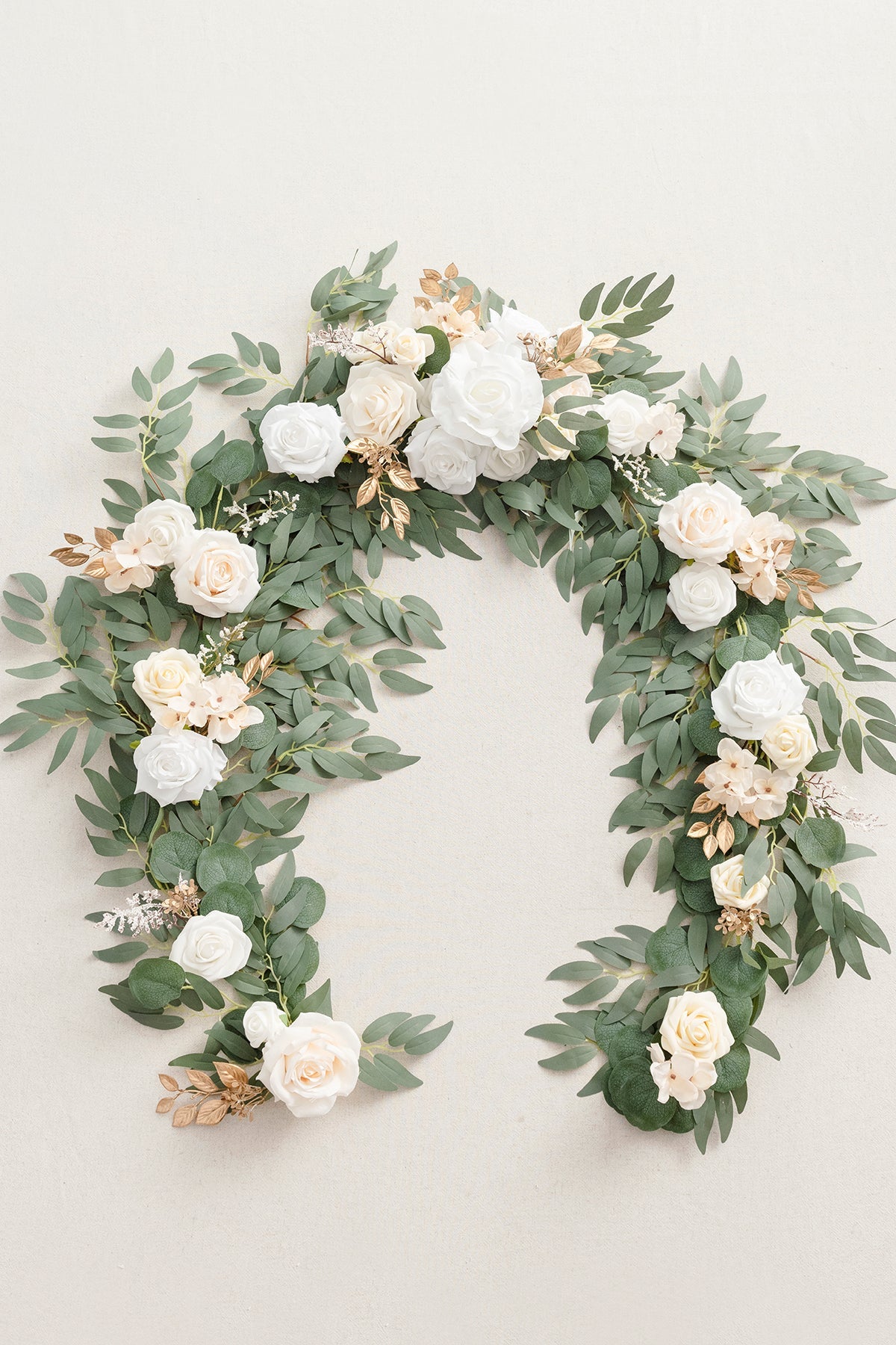 On silk eucalyptus and willow leaf garlands base . rose as the main flower . accented with avalanche rose . hydrangea . white grass . and banyan leaf . create a different full layering and sense of romance. Perfect for your wedding reception.