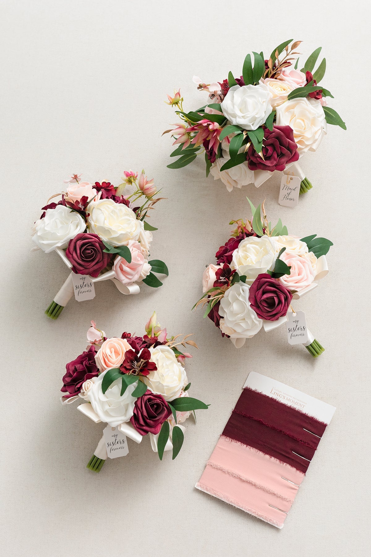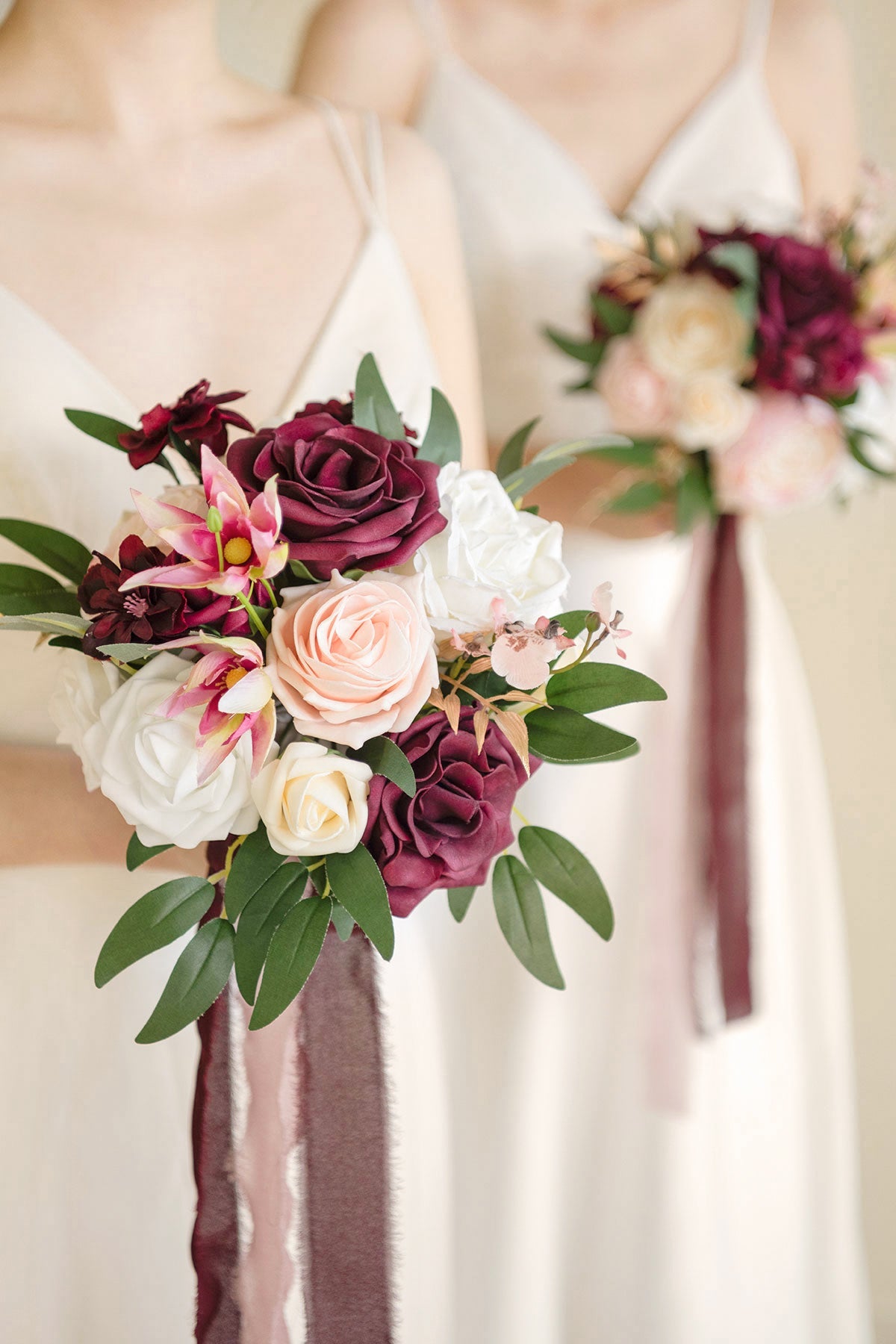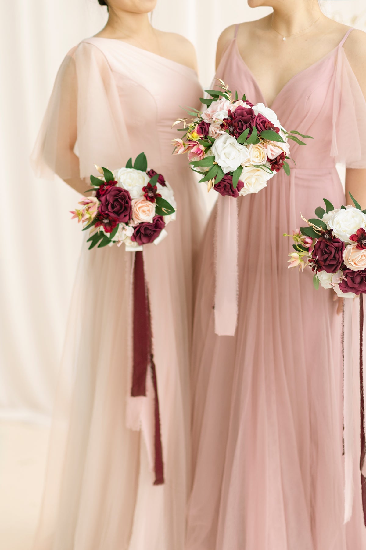 - Package: A bridesmaid bouquet attached with 5ft long marsala and blush chiffon ribbon. Make it easy to choose different numbers of bridesmaid bouquets for your wedding.
