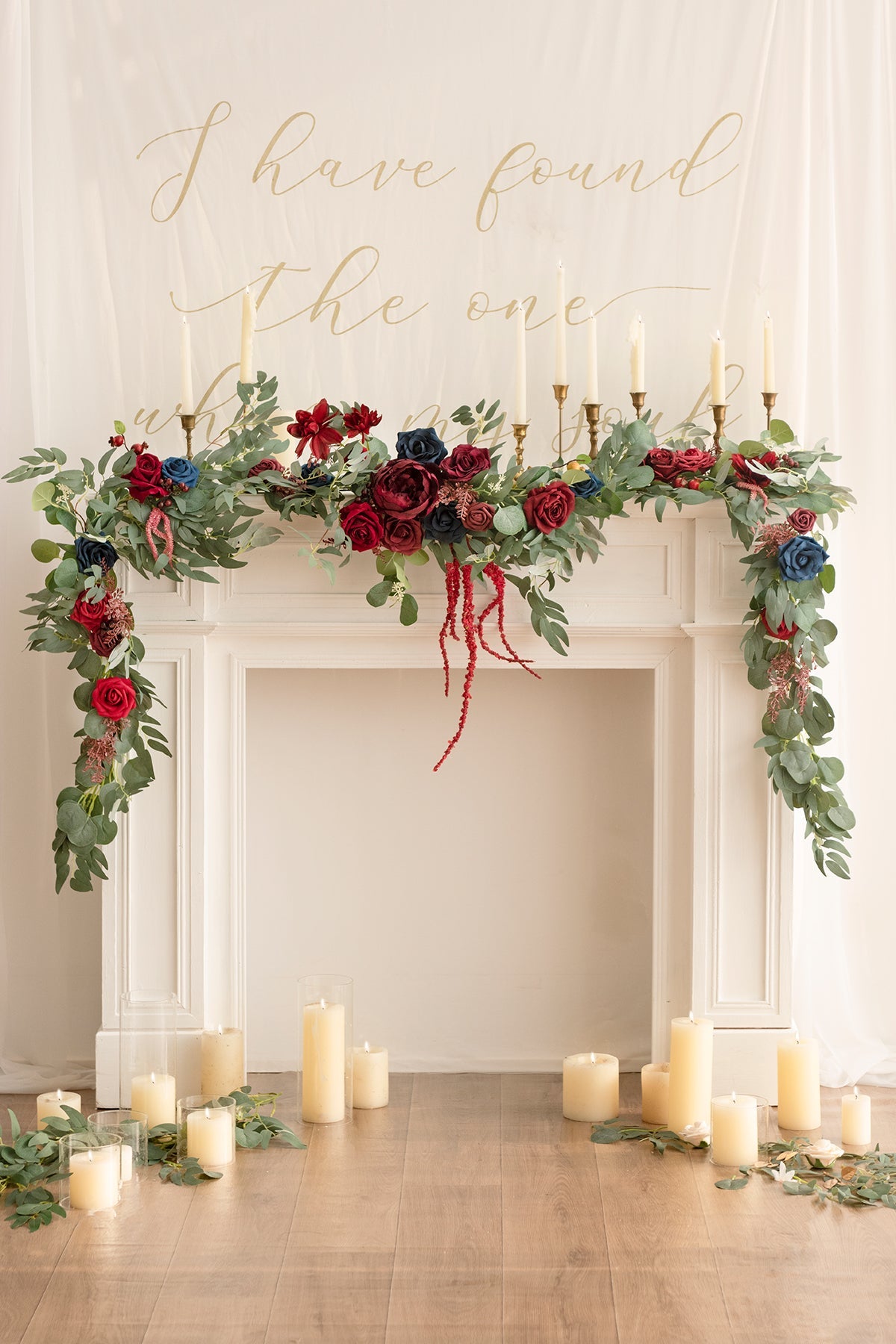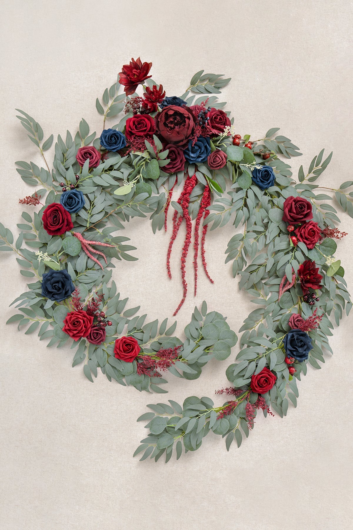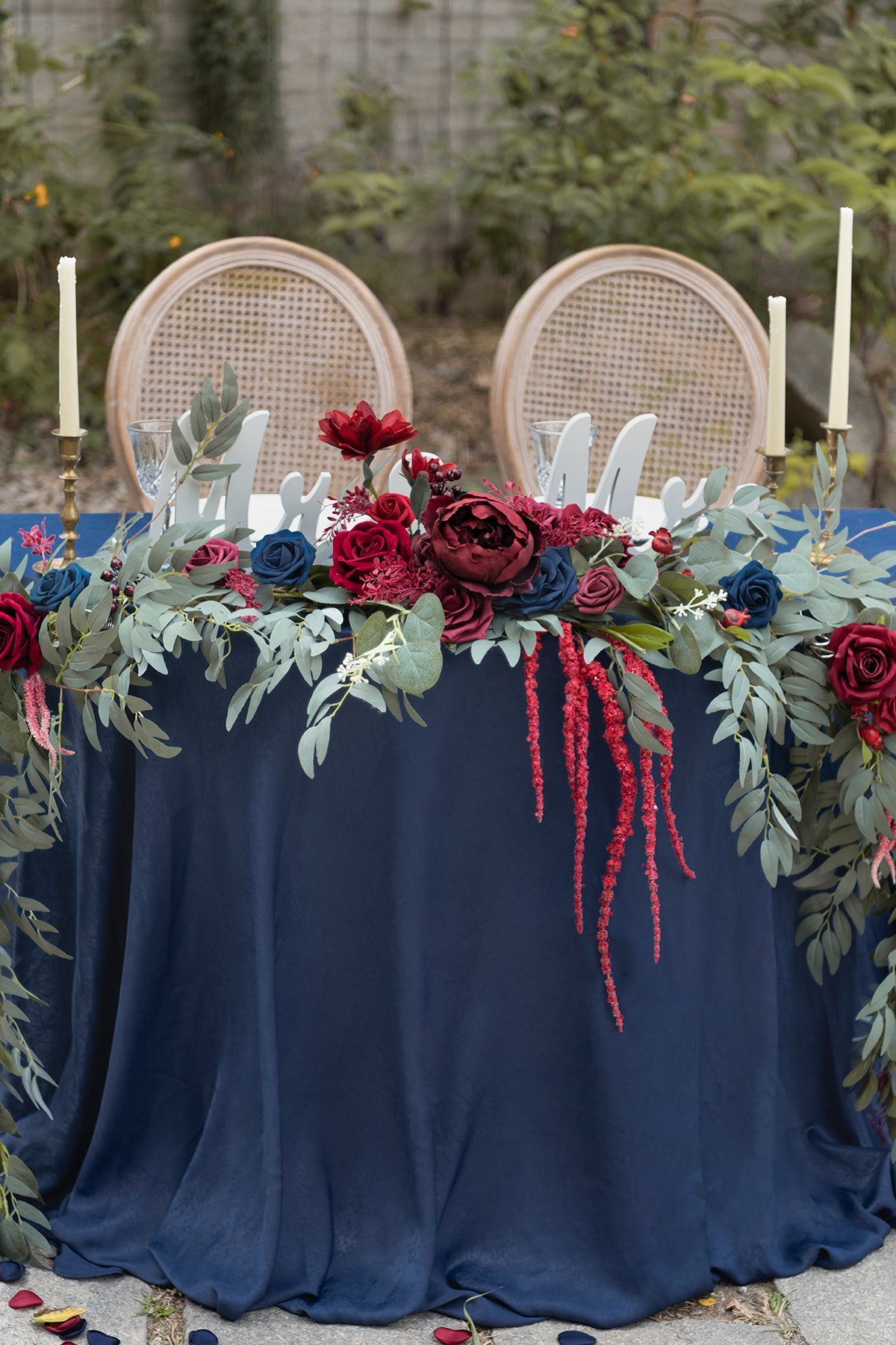 - Material: Handmade with silk/foam flowers and silk leaf garlands. Total about 40 flowers. Frank burgundy and the purely navy blue is your silent oath. The burgundy peony and navy blue rose as the main flower . dotted with silk dahlia . and the amaranthus tassel as hanging decor perfectly blend with eucalyptus leaves . helping to create your unique . rustic . and elegant/classic wedding.