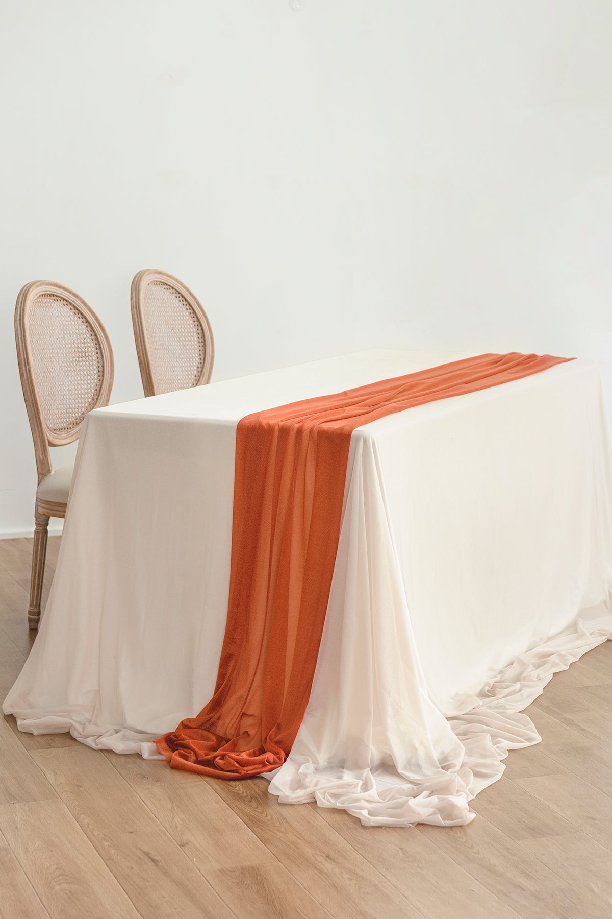 - Material: 100% polyester. The thermal cutting no seaming technique makes this sheer table runner more graceful than traditional fabrics.