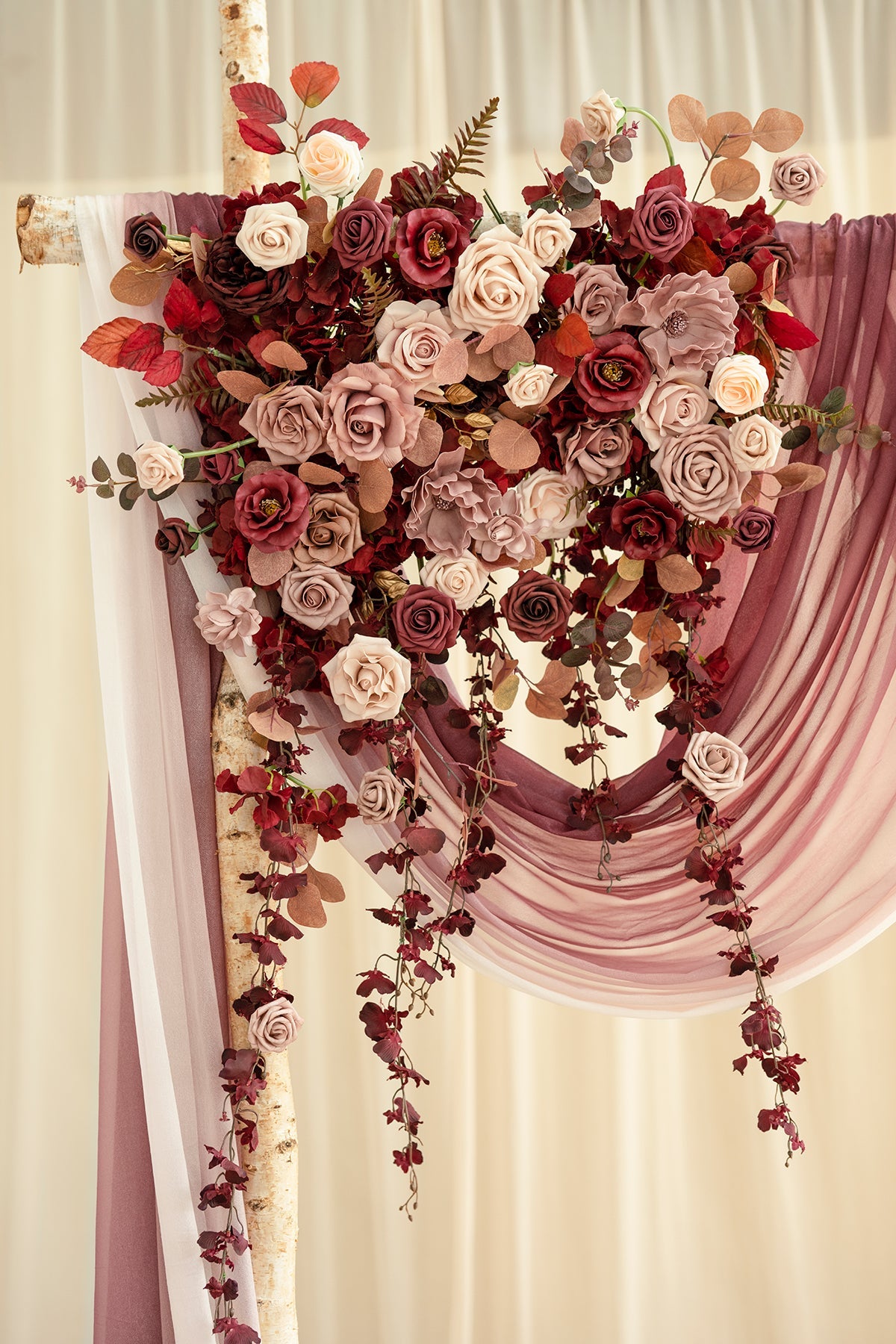 - Package: Pre-made flower arrangement x2 . cable tie x4 . transparent pasted hook x 4. (The draping fabric and arch are not included . we recommend purchasing the drape together)