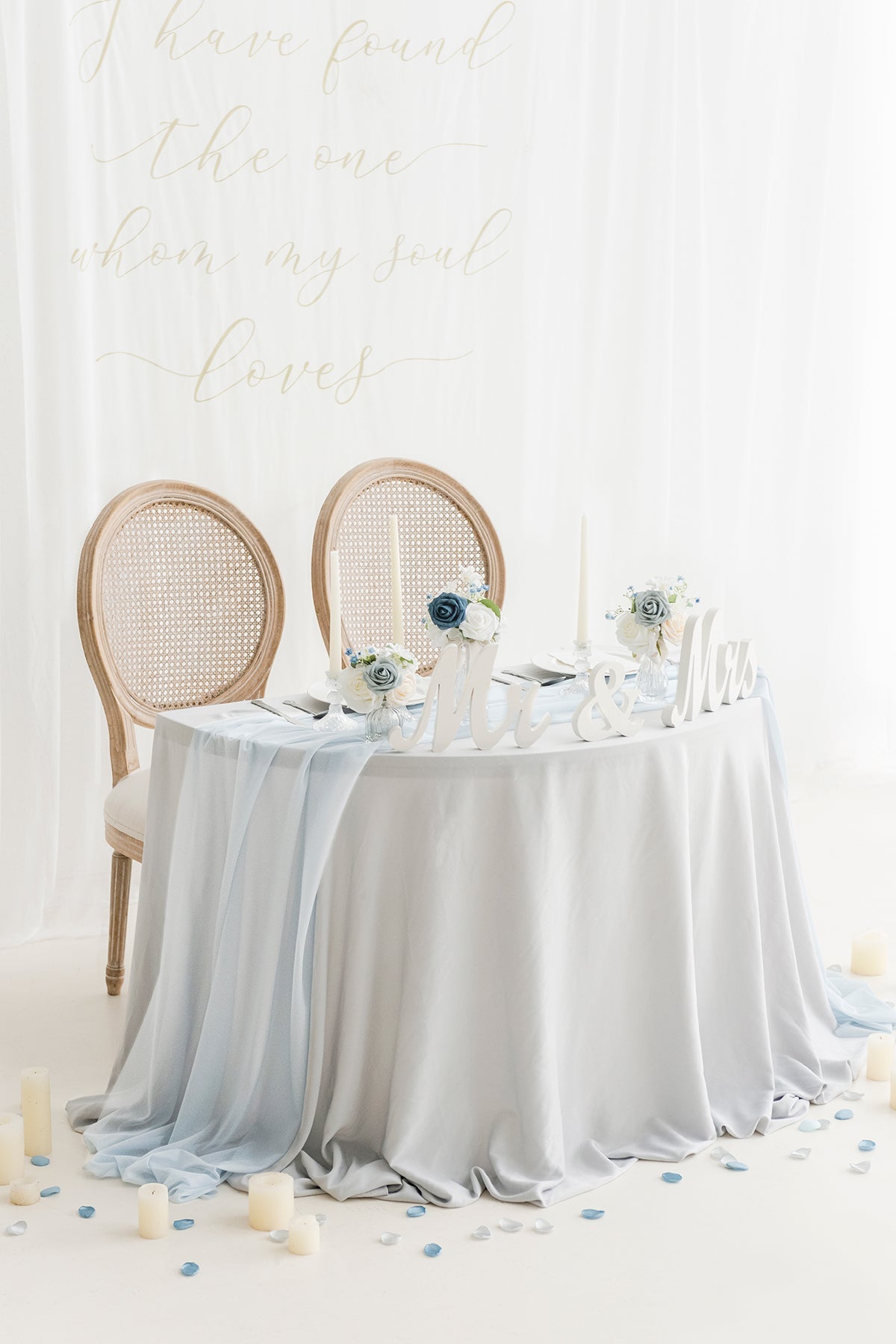 Unique wrinkle-resistant fabric makes this table runner READY TO GO. Two ribbon ties are included for gathering soft luminous folds looking at both ends. Or you may just let it drapes gracefully across your table and flows onto the floor in dreamy pools of fabric.