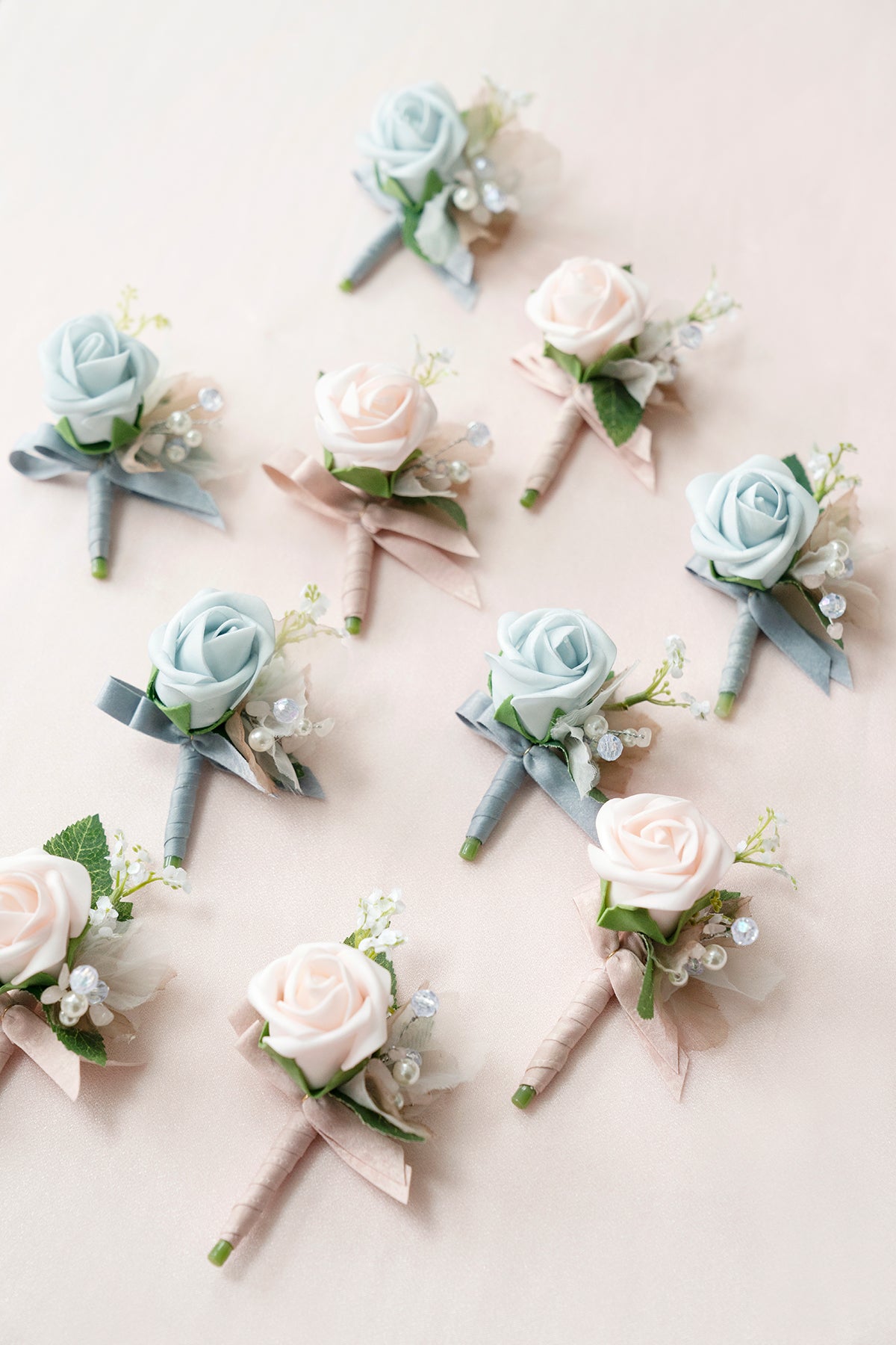 - Material: The boutonnieres are made of foam blue rose . foam blush rose . silk rose . white pearls . crystal . etc.