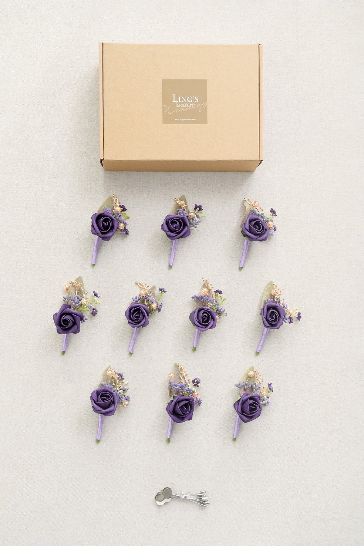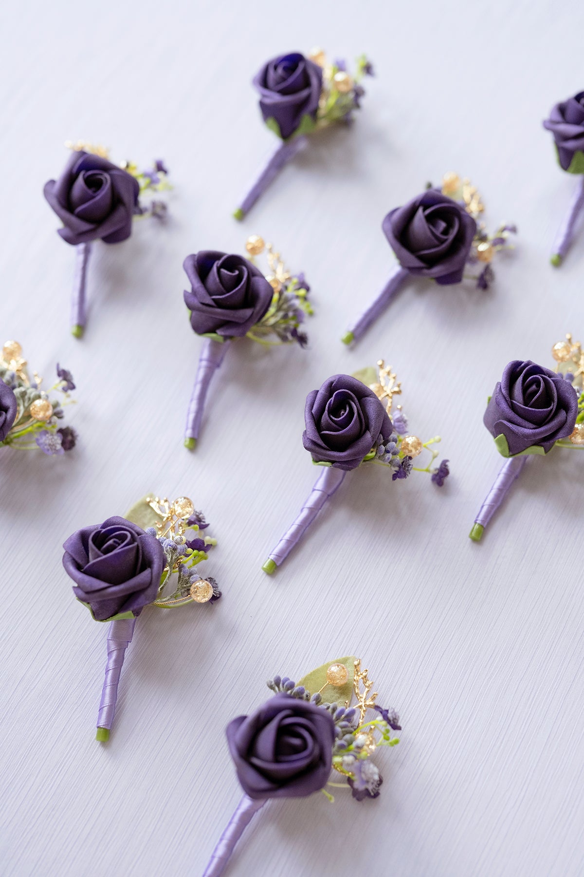 - Material: The boutonnieres are made of real-looking purple rosebud . dotted with Salvia Officinalis . purple baby's breath . purple berries . champagne gold bead floral pick . and golden branch.