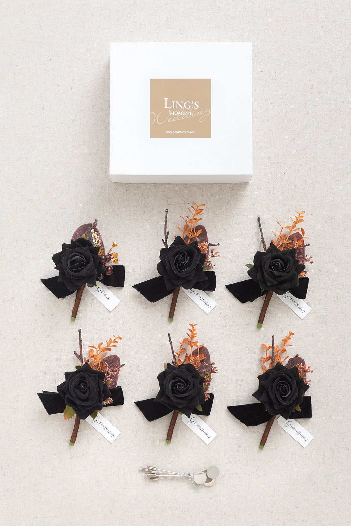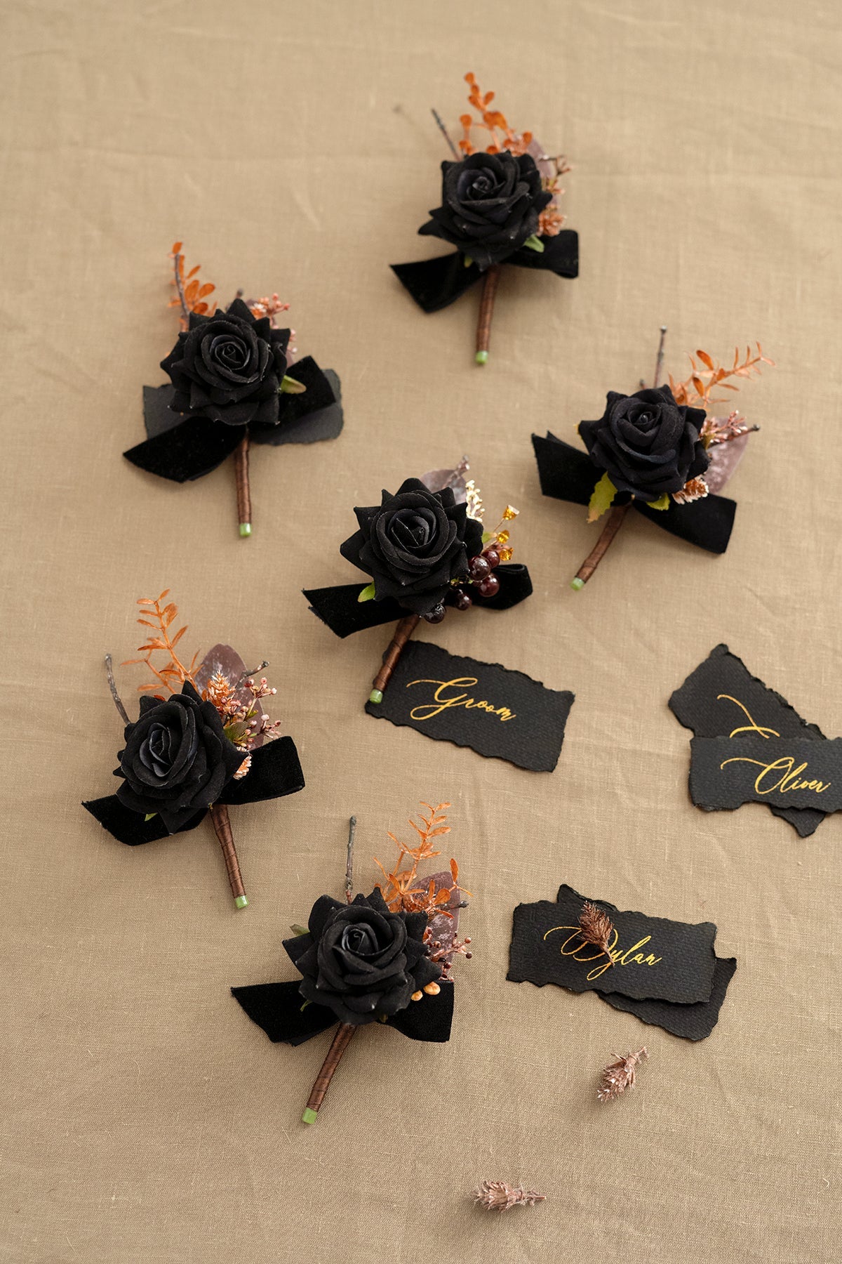 - Material: The boutonnieres are made of black hybrid tea rose . dotted with burgundy eucalyptus . burgundy pine branch . burgundy berries . golden stem floral pick . and amber stone floral pick.