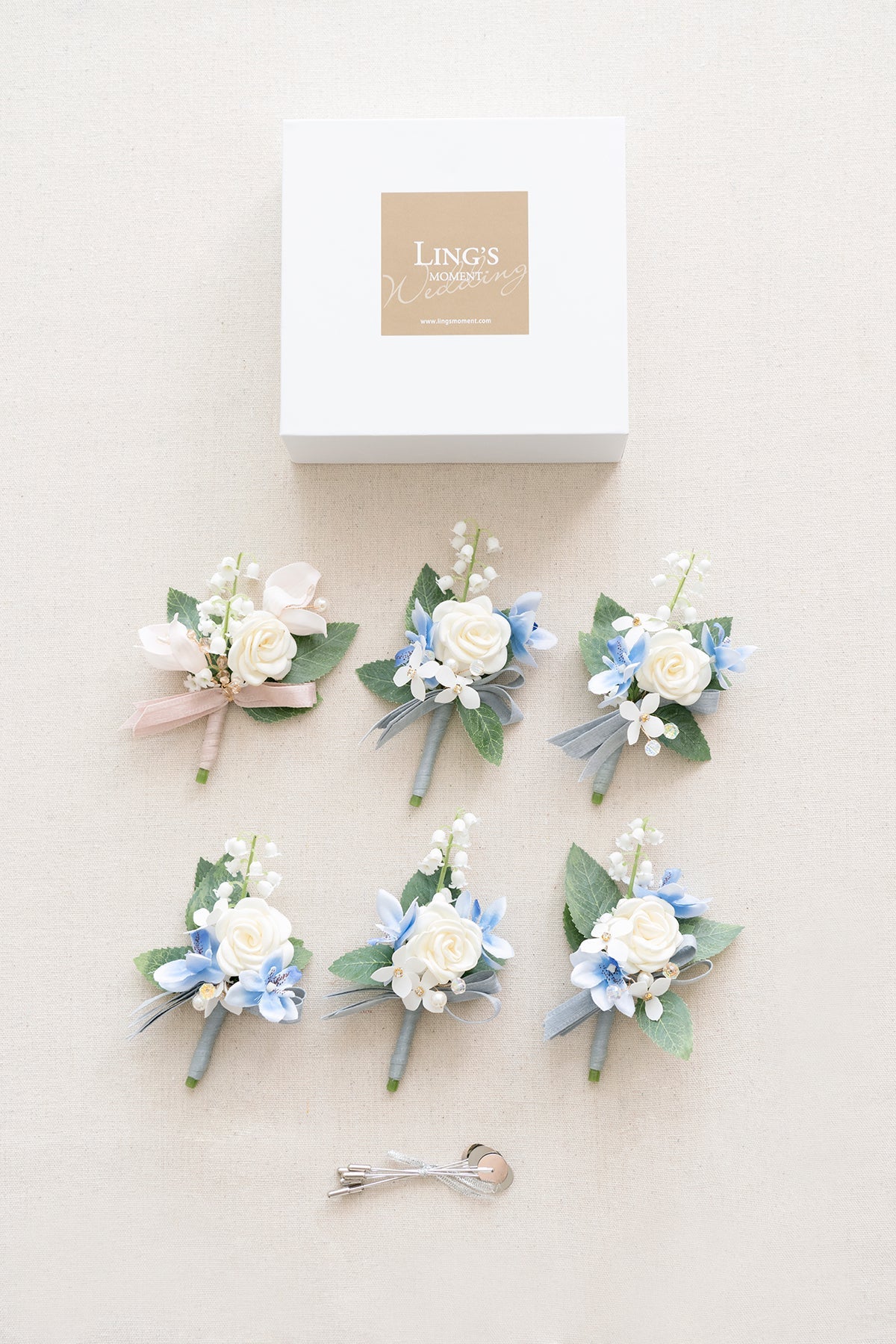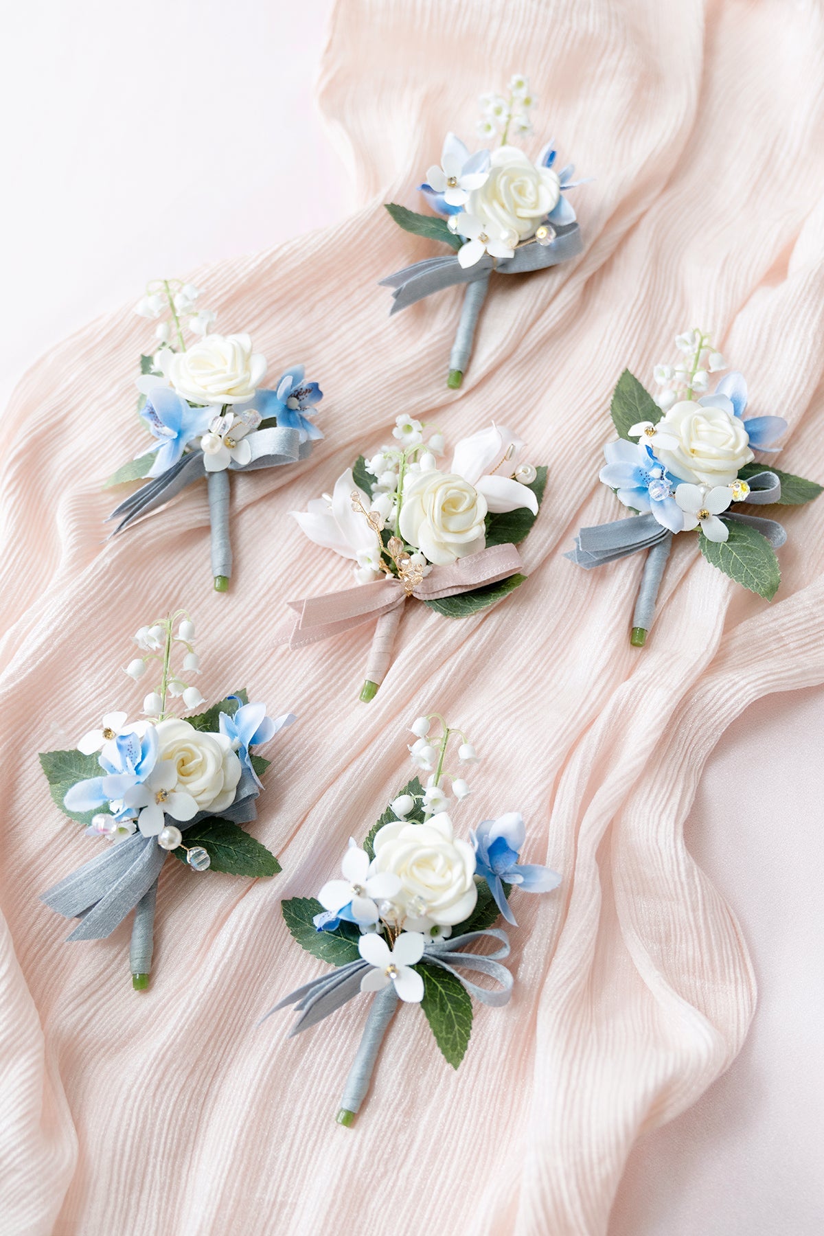 - Material: The boutonnieres are made of cream silk camellia . blush foam gardenia bud . blue silk petite Orchids . lily of the valley . dotted with sage green rose leaves . pink crystal floral pick . and pearl floral pick.