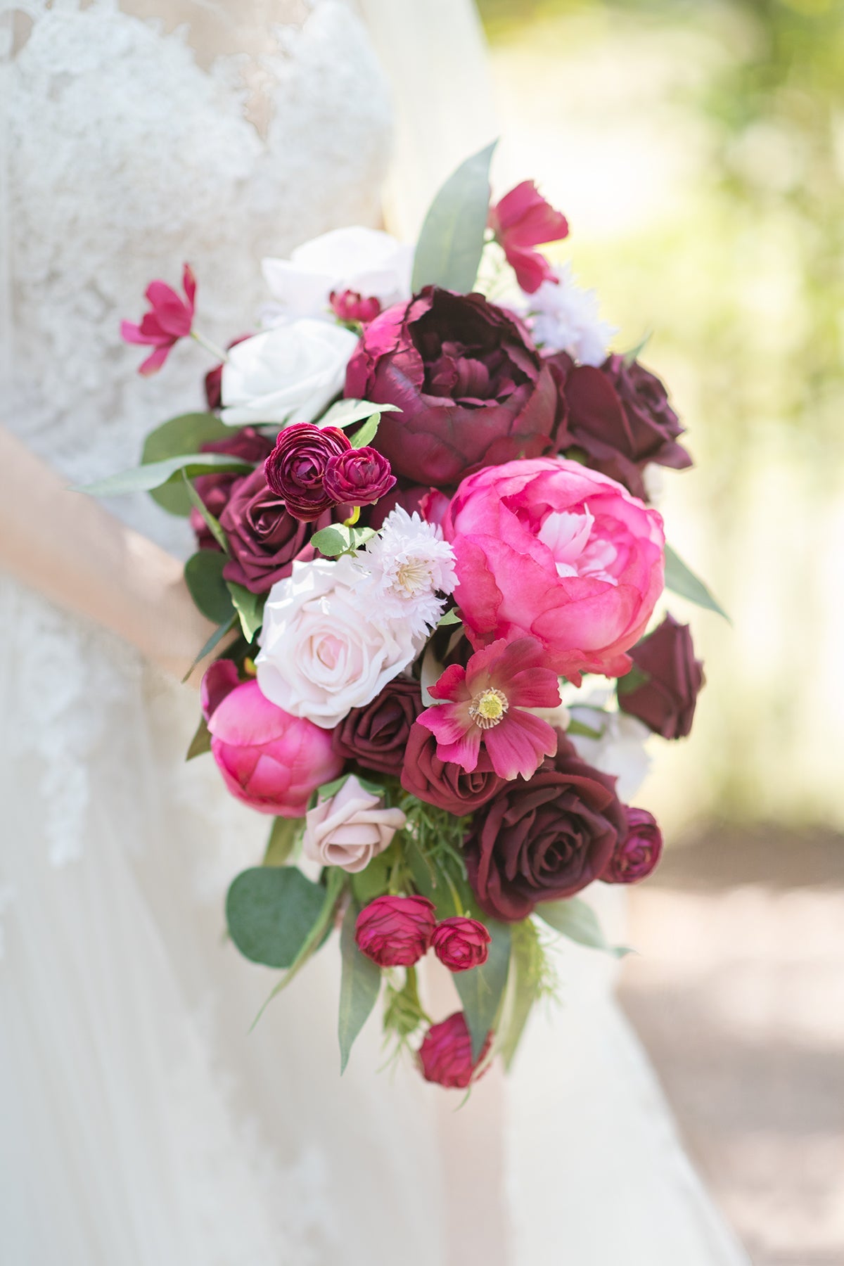 - Bouquet Material: Made of high-quality artificial flowers and greenery. Silk flowers include burgundy avalanche rose . fuchsine closed peony . blush avalanche rose . pink Austin rose . burgundy ranunculus . and fuchsine daisy; Foam flowers include white rose . blush rose . marsala rose; Greenery includes eucalyptus leaves and some other accessories.