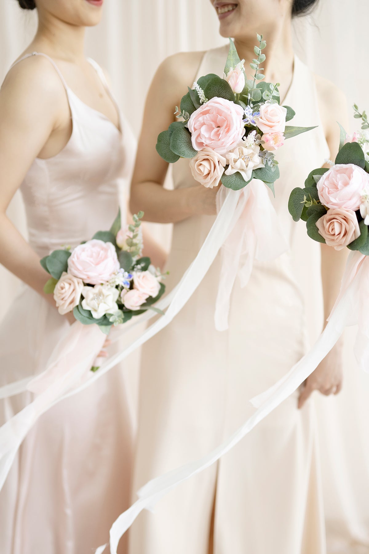 - Package: 7-inch bridesmaid bouquet . set of 6. Each bouquet is attached with a 5ft blush chiffon ribbon and a 5ft white chiffon ribbon. There are a total of 12 ribbons pre-bound on the card.