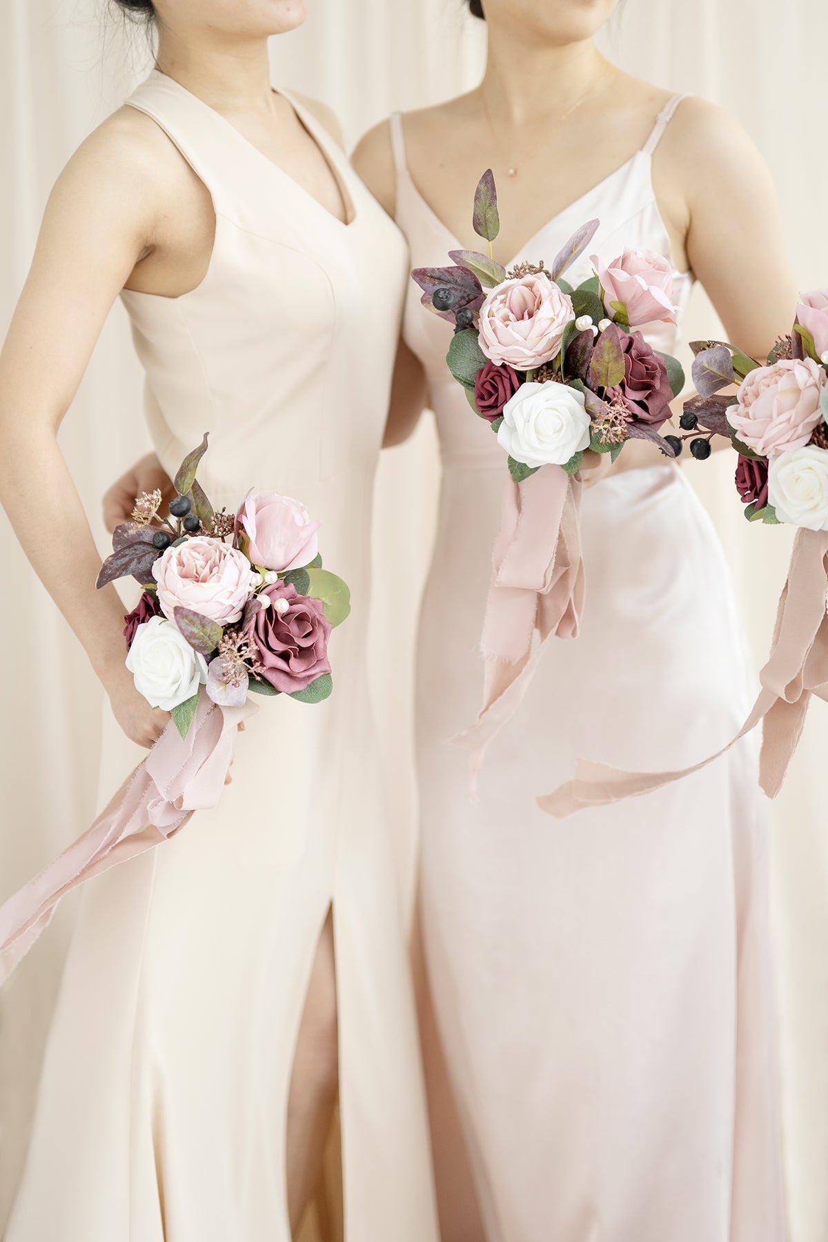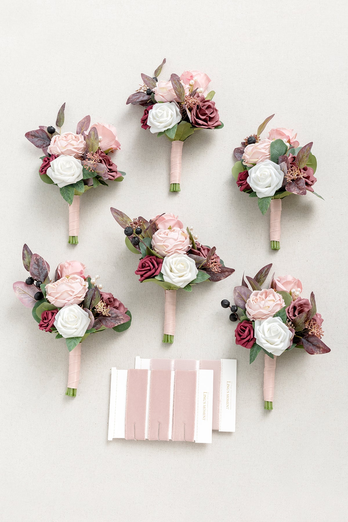- Package: 7-inch bridesmaid bouquet . set of 6. Each bouquet is attached with a 5ft nude chiffon ribbon and a 5ft dusty rose chiffon ribbon. There are a total of 12 ribbons pre-bound on the card.