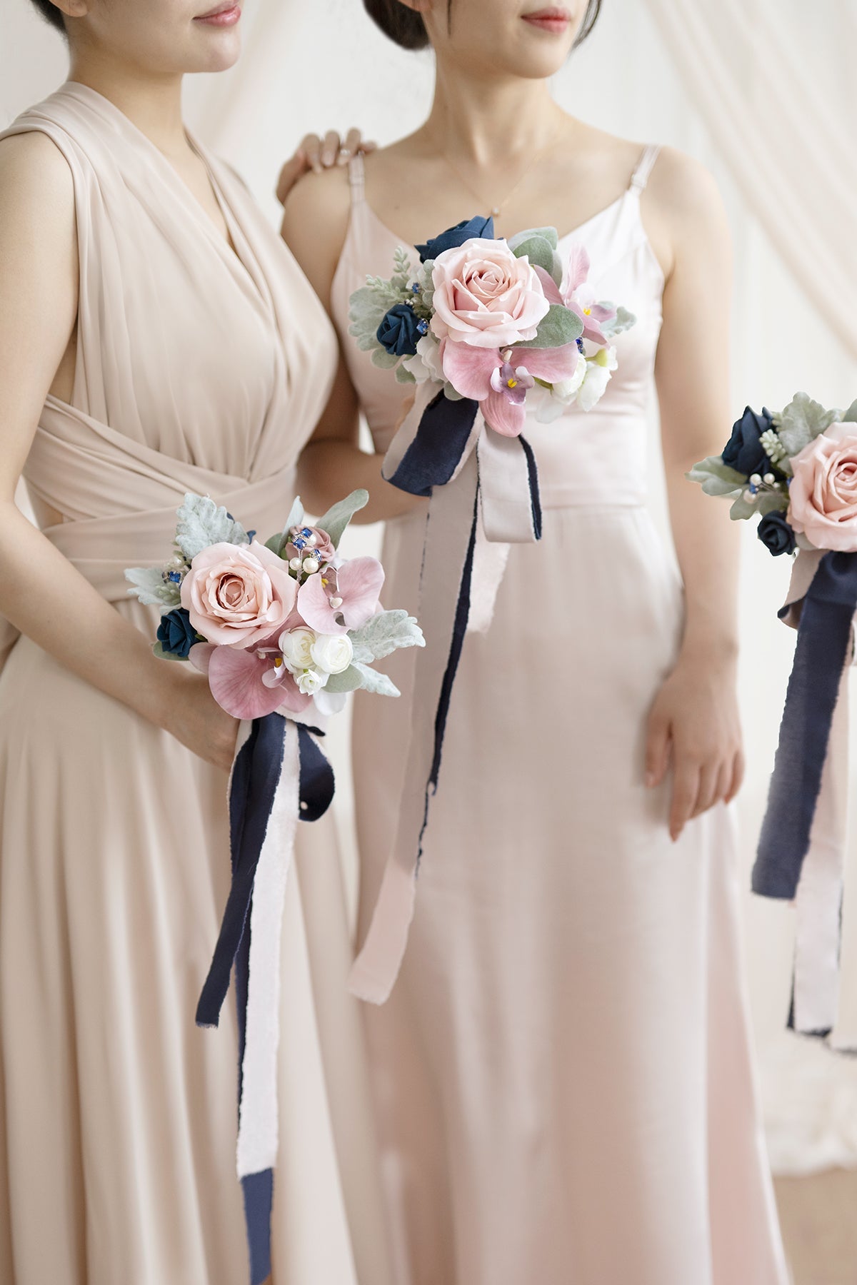 - Package: Set of 6 bridesmaid bouquets attached with ribbon. Ribbon card x1The bouquet is attached with a powder blue chiffon ribbon and a navy blue chiffon ribbon. Ribbons' size is approximately 1.5" wide and 3.25ft long.