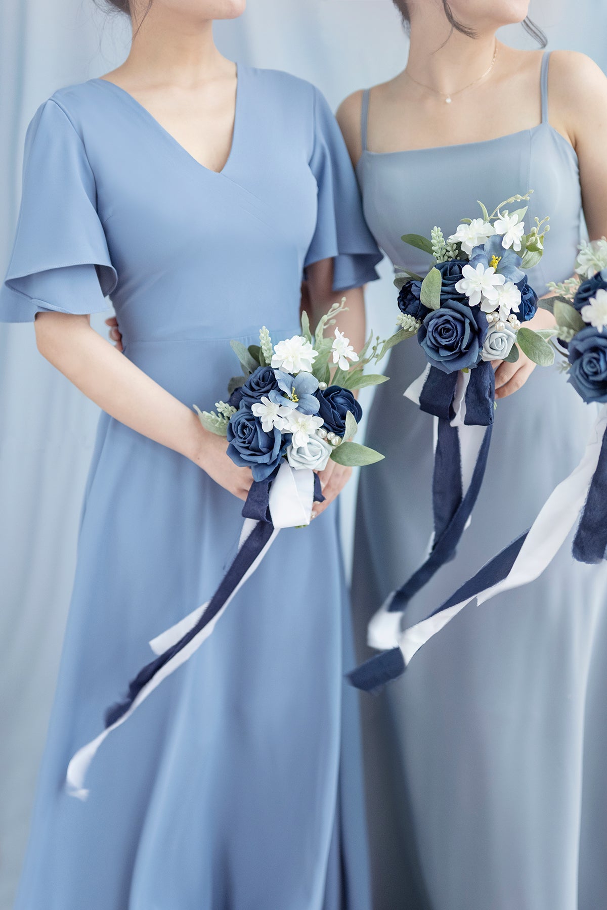 - Package: Set of 6 bridesmaid bouquets attached with ribbons. Ribbon card x1 . ribbon in navy blue and white x1 (1.5Yd long per color in the chart).