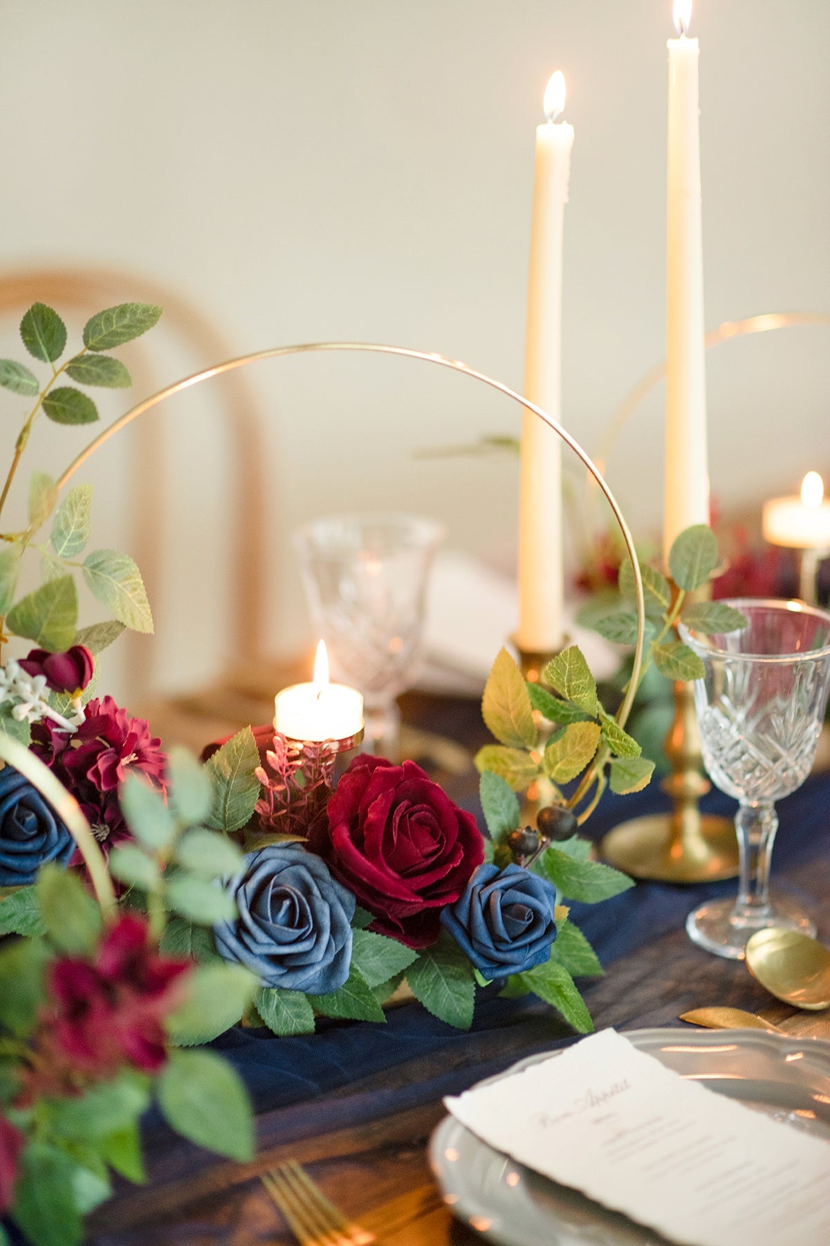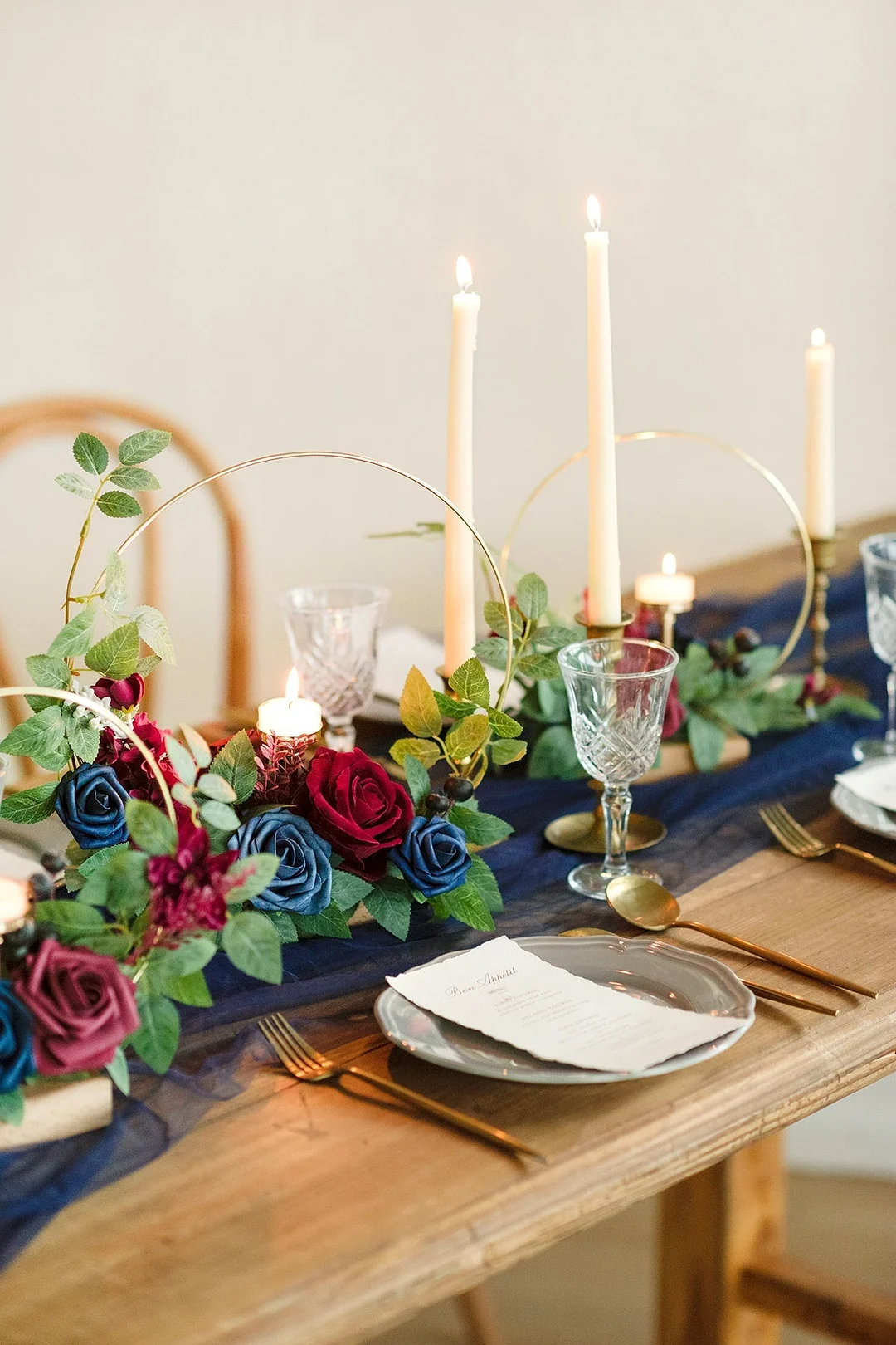 The combination of Burgundy & Navy flowers and metal makes your wedding event look vintage . cozy . and breathtaking.