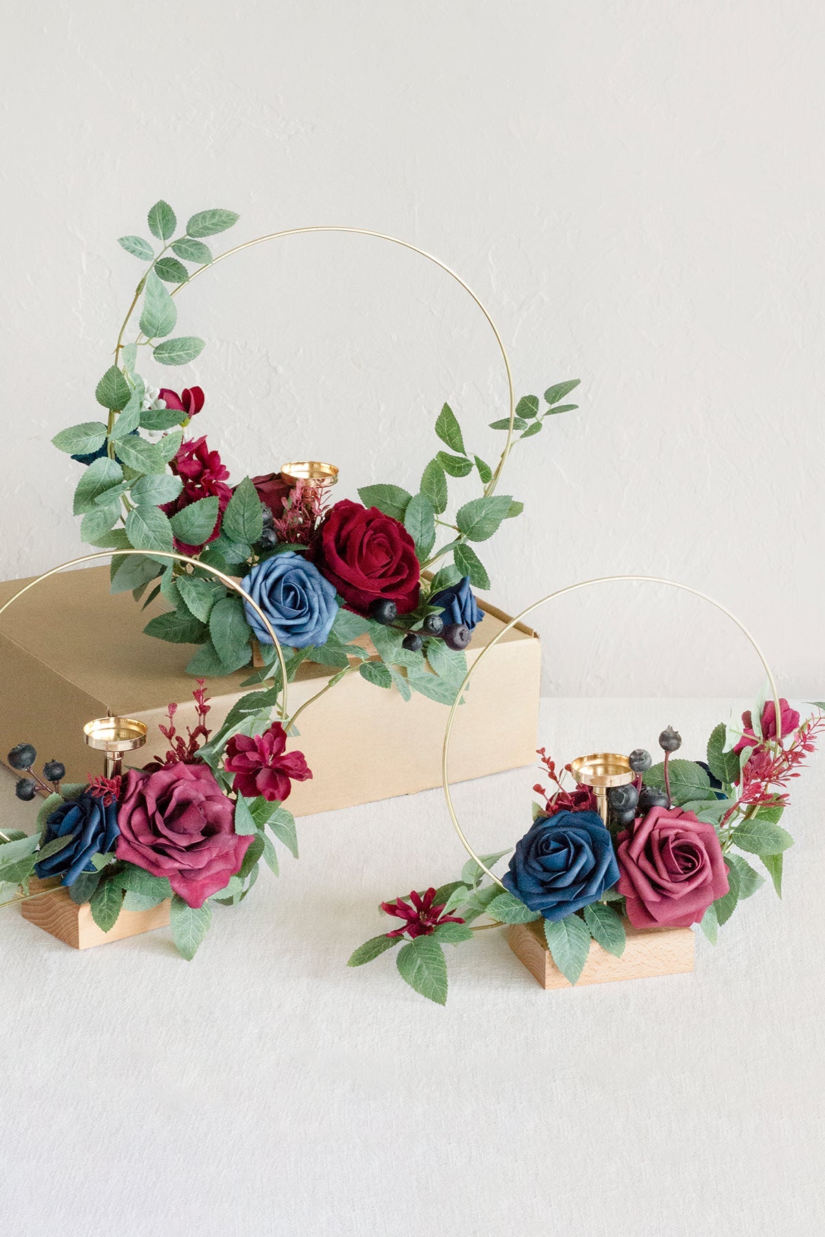 - Material: The flower arrangement is made of foam/silk flowers. The holders are made of high-quality gold ring candle holders and wooden bases.