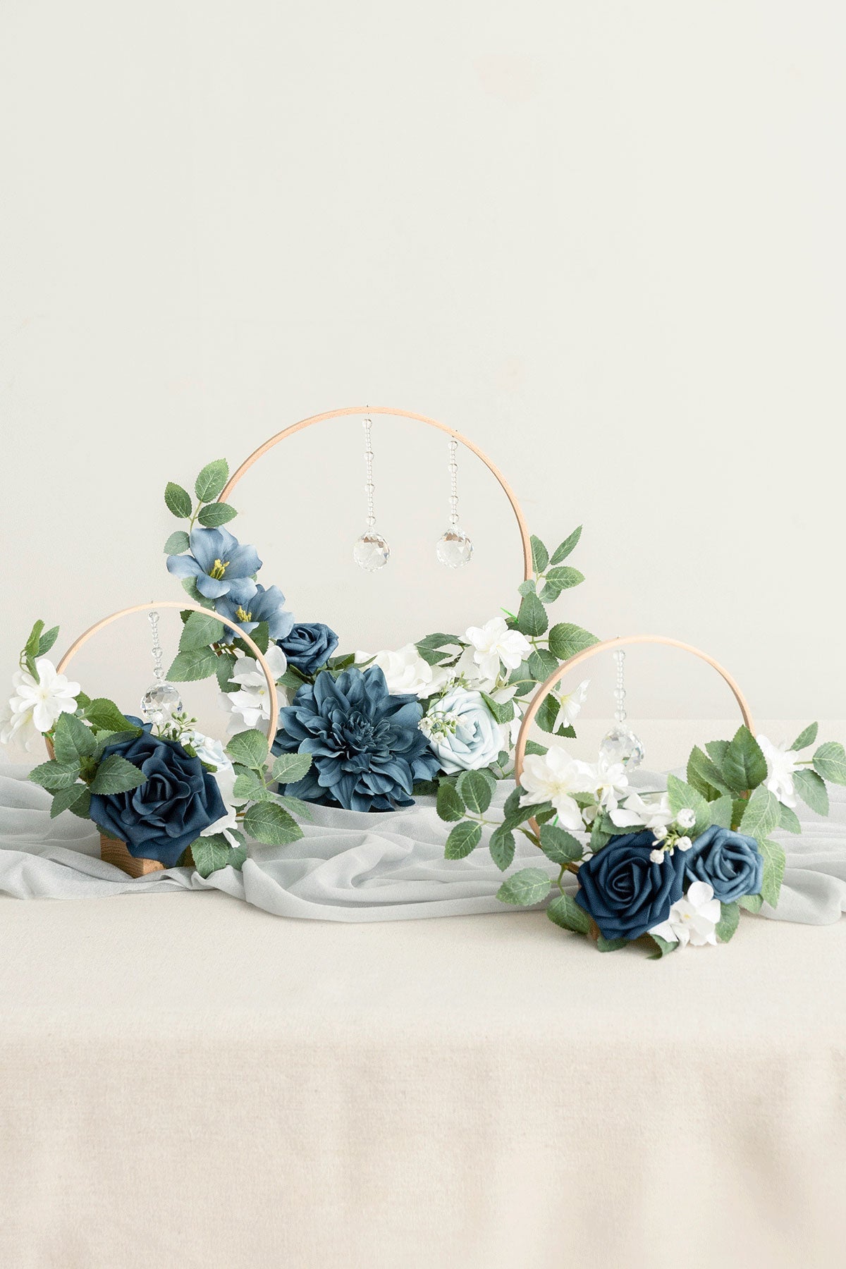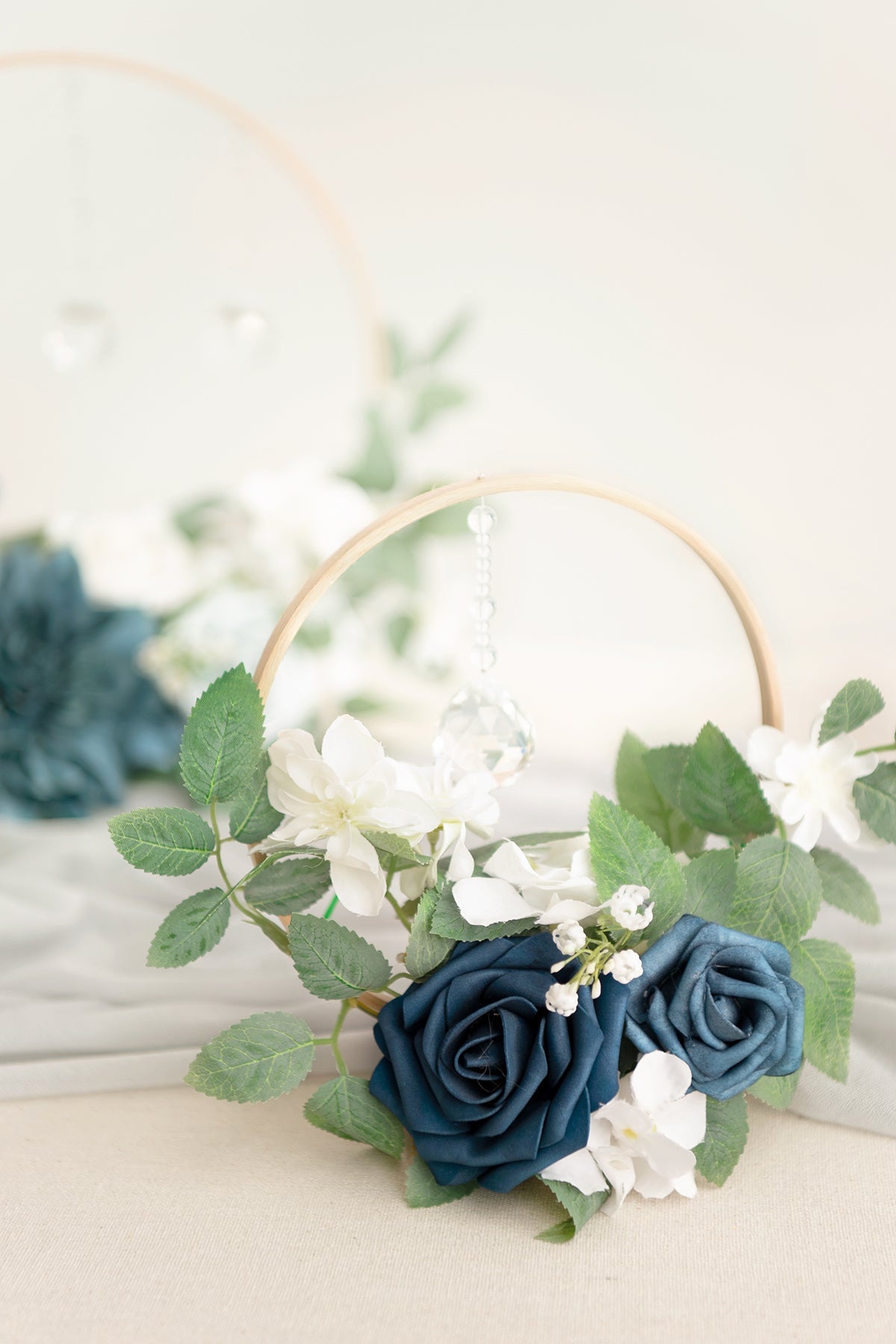 - Material: The holders are made of high-quality beech with detailed rustic grains. The flower arrangement is made of real-looking navy blue . dusty blue . and rose and peony . dotted with crystal . little white flowers . and eucalyptus.