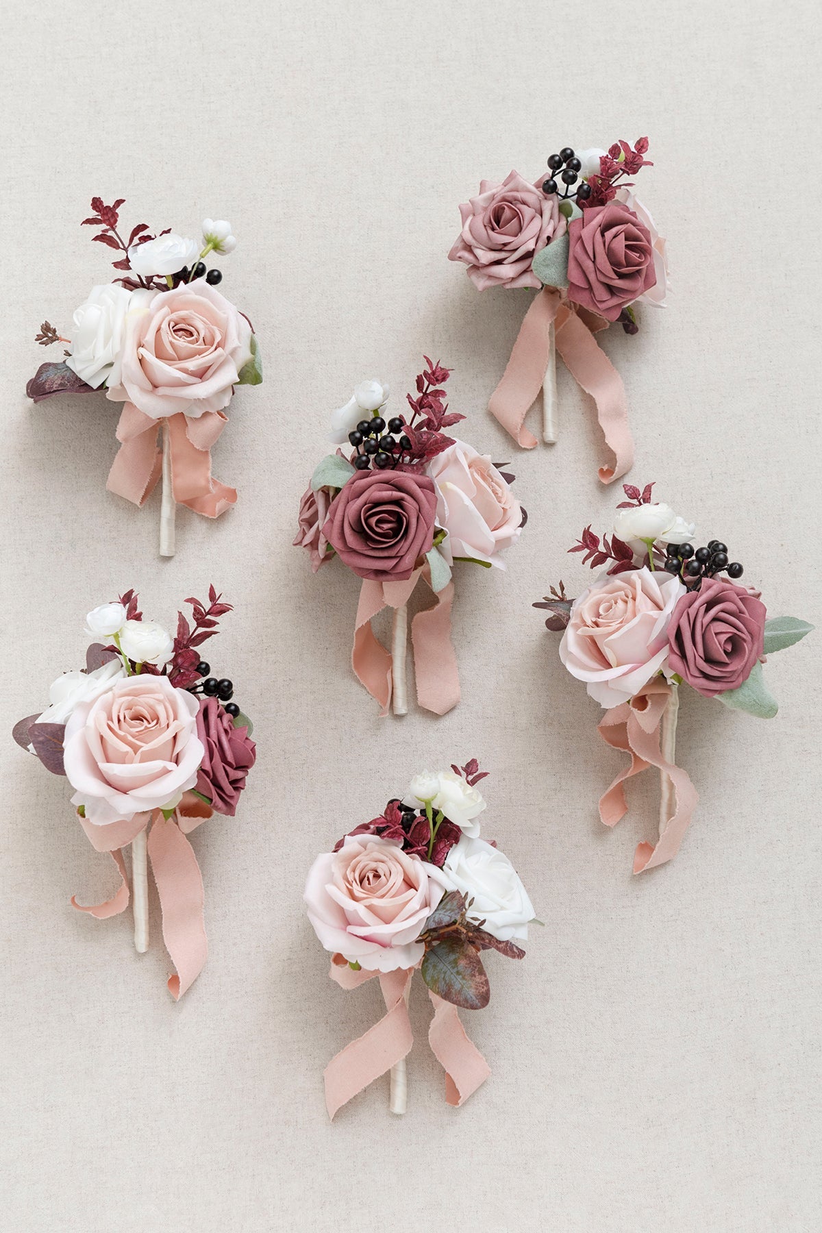 - Materials: This dusty rose & mauve set was made with dusty pink silk Escimo rose . mauve rose . dusty rose hybrid tea rose . white rose . white ranunculus fill with red eucalyptus . berry . flocked lambs ear leaf spray . and mauve mint leaf.