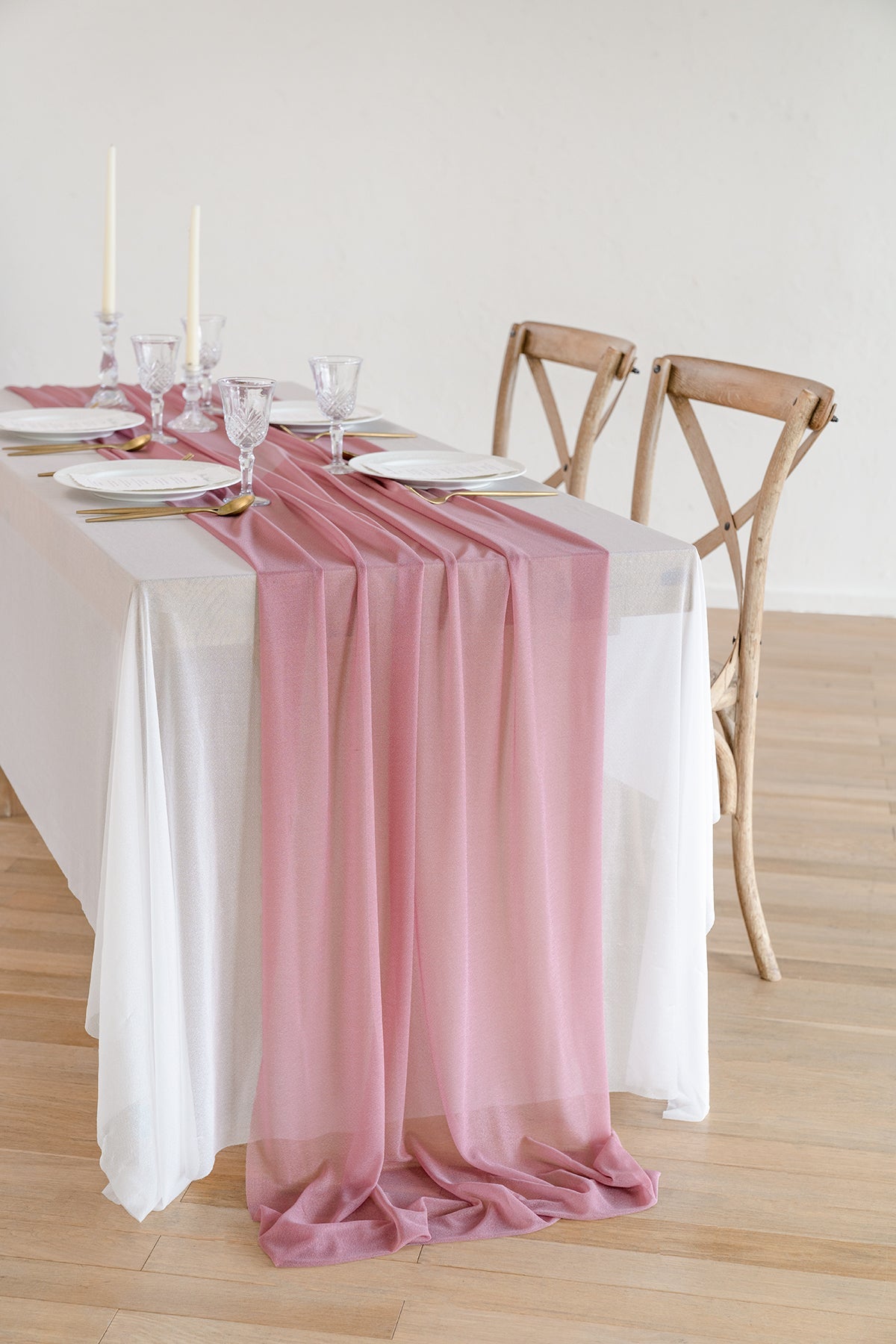 Unique wrinkle-resistant fabric makes this table runner READY TO GO. Two ribbon ties are included for gathering soft luminous folds looking at both ends. Or you may just let it drapes gracefully across your table and flows onto the floor in dreamy pools of fabric.