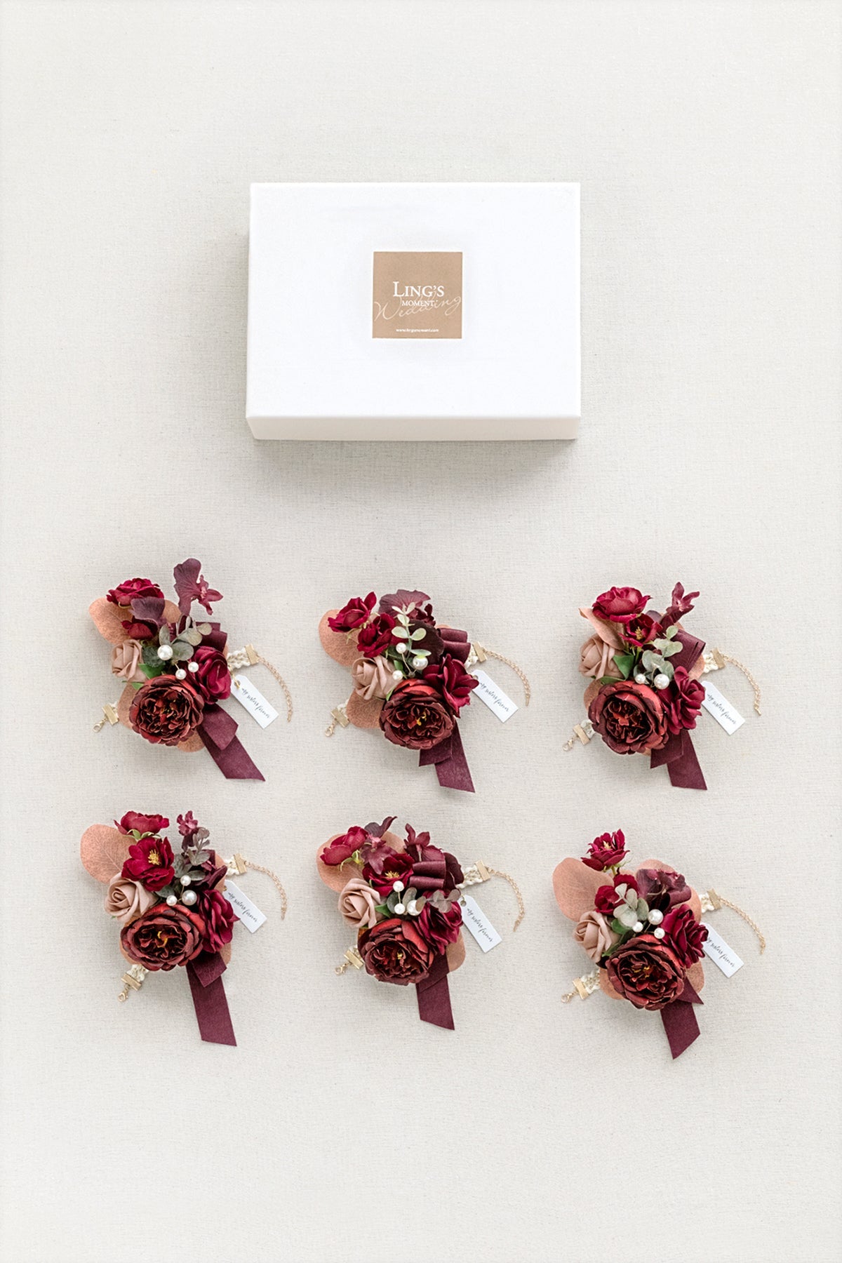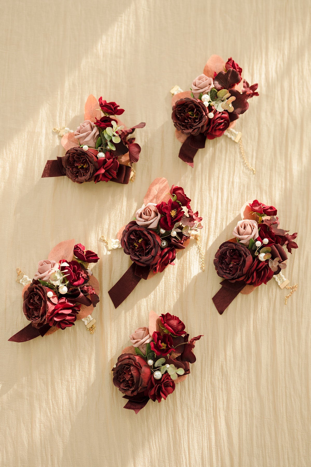 The elegant wrist corsages are made up of burgundy silk Austin rose . burgundy silk camellia . burgundy phalaenopsis . dusty rose foam rose bud . accented with pearl floral pick . dusty rose eucalyptus leaves . etc.