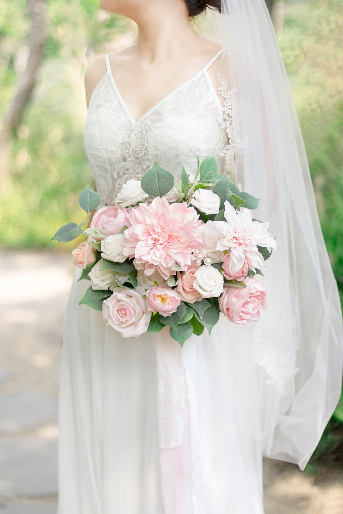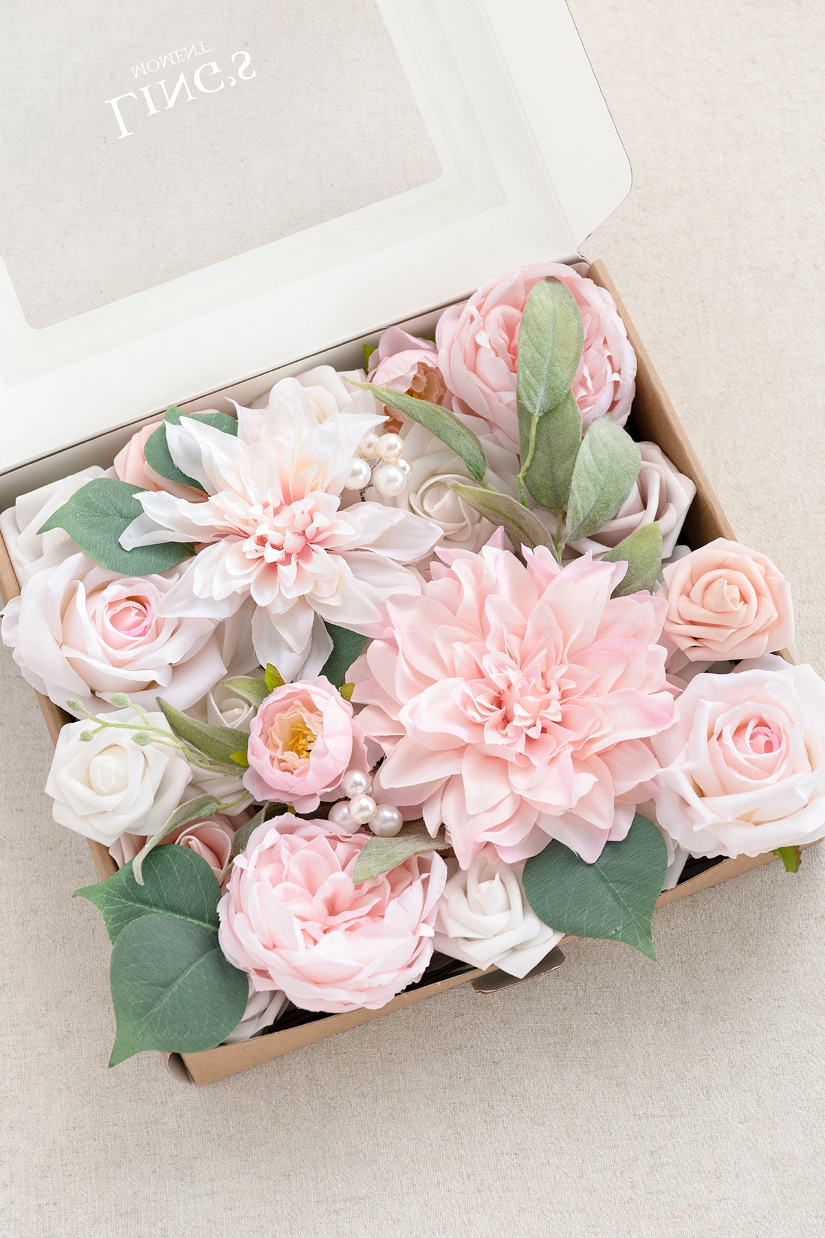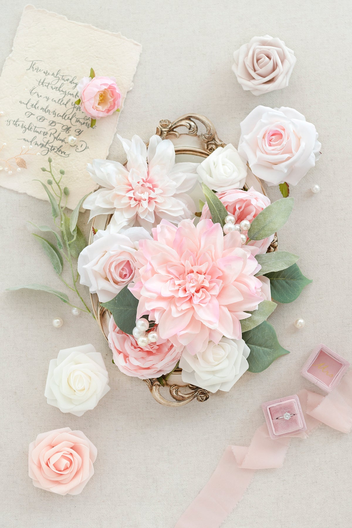- Silk Flowers: blush semi-cactus dahlia x1 . pink heirloom semi-cactus dahlia x1 . pink heirloom Vendela rose x2 . blush Austin rose x2 . petite peony x2