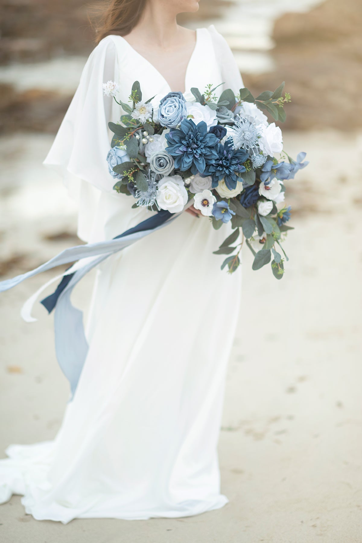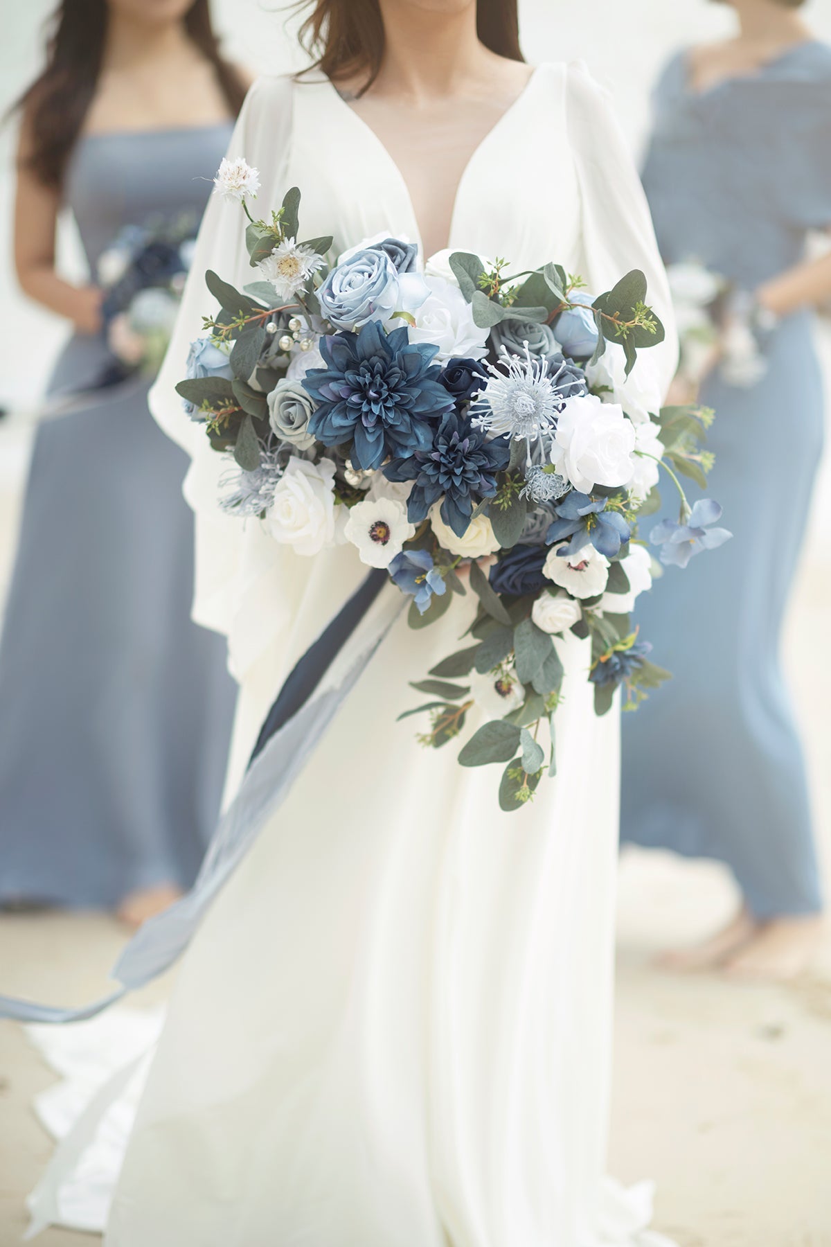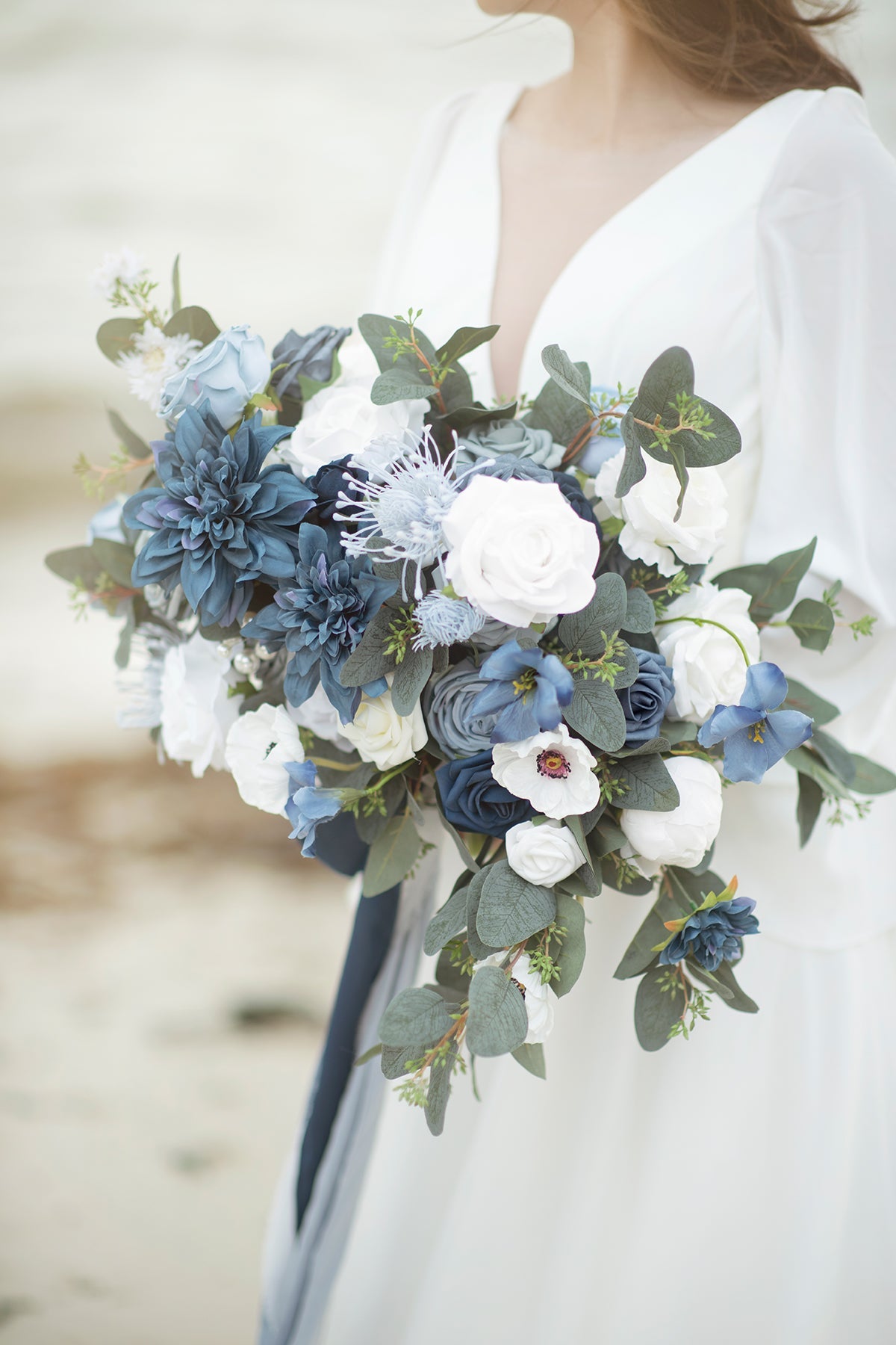 Reference: The 17" wide bouquet in the image is made by 1 box of Vintage Dusty Blue flowers box set . 1/3 box of Elegant Navy Blue deluxe flowers box set . 1 box of Dutch Blue & Dusty Blue Foam Rose . and 1/3 box of Seeded Oval Eucalyptus.