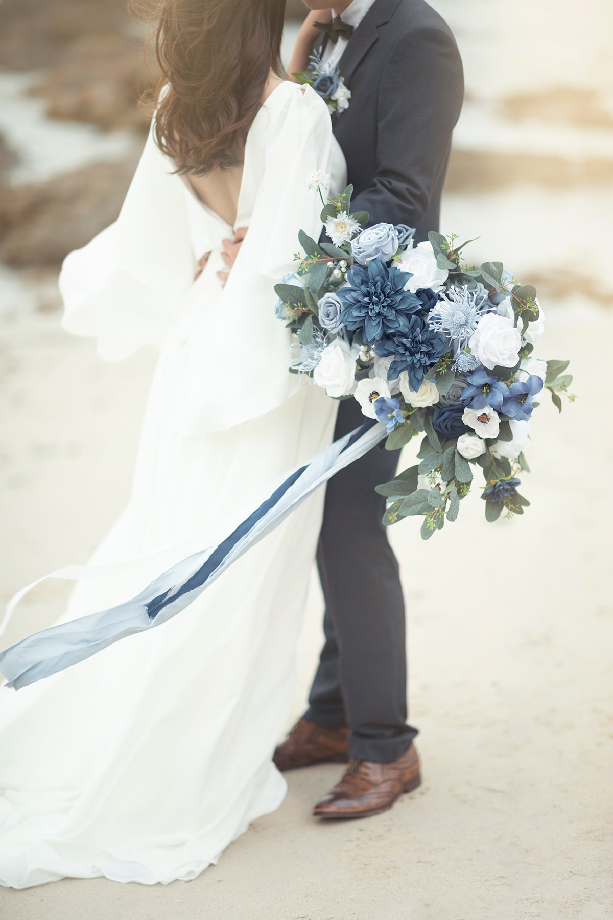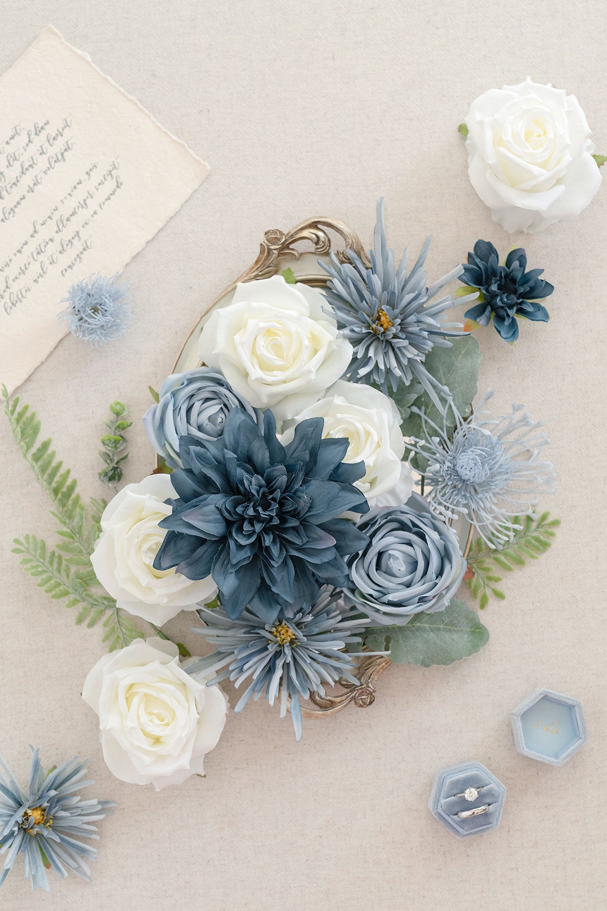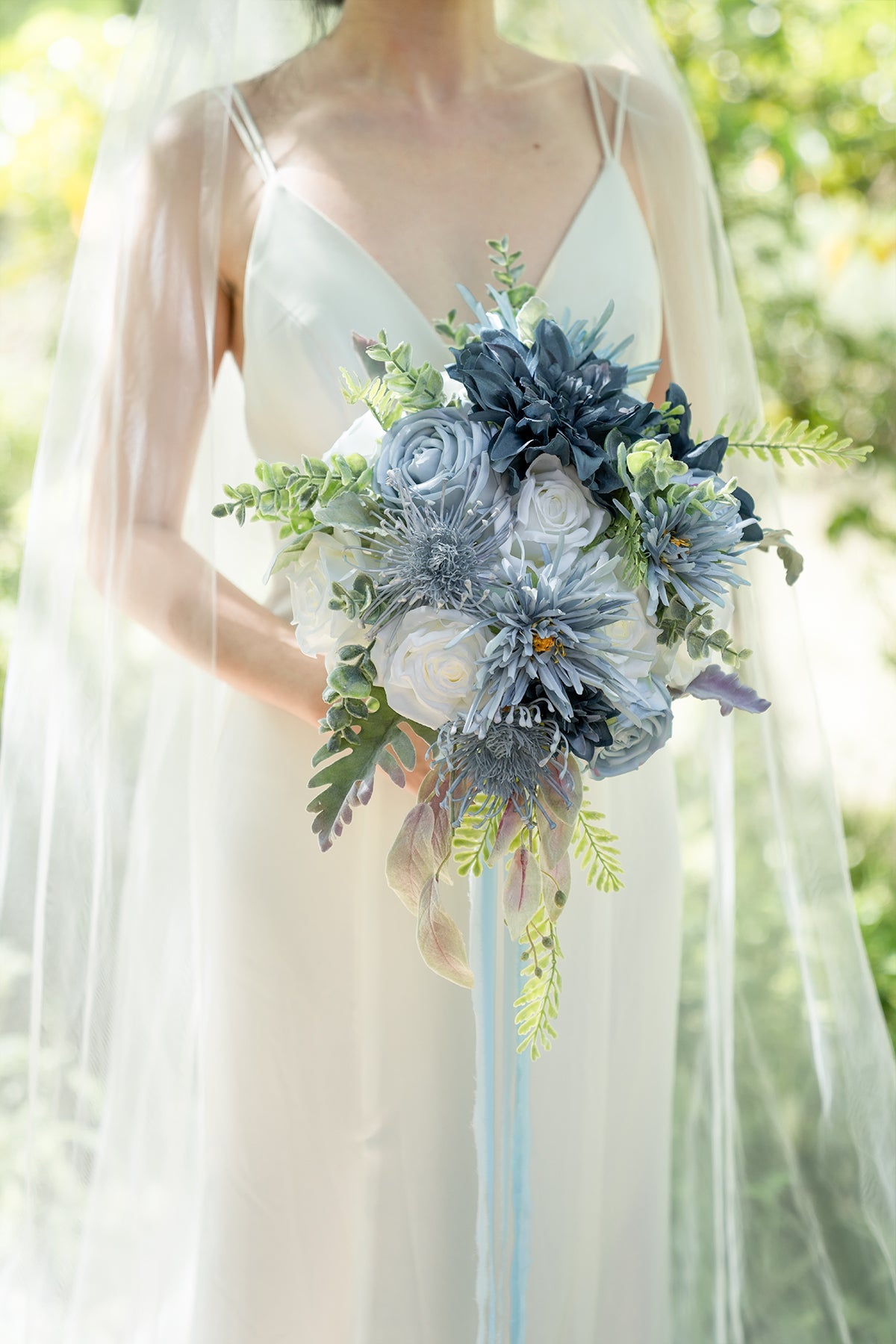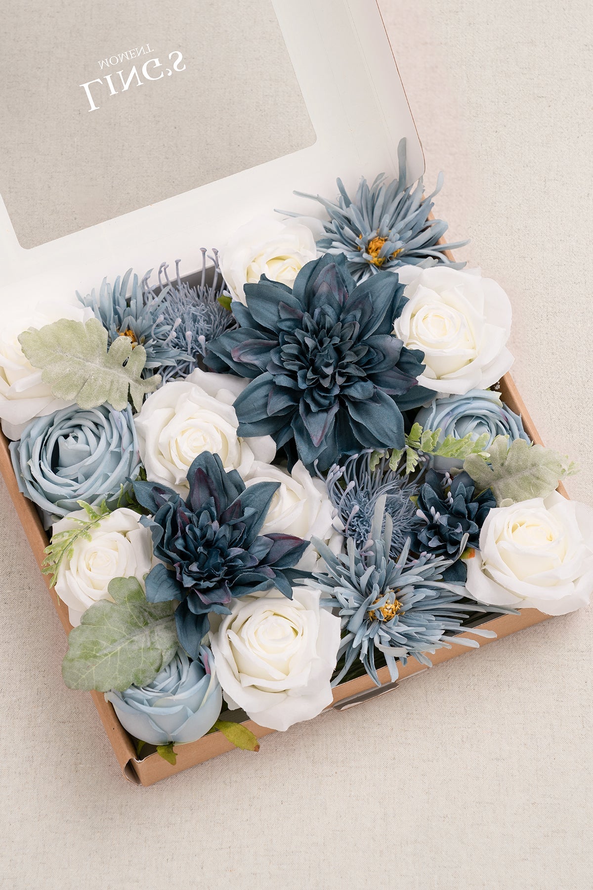 Reference: The 17" wide bouquet in the image is made by 1 box of Vintage Dusty Blue flowers box set . 1/3 box of Elegant Navy Blue deluxe flowers box set . 1 box of Dutch Blue & Dusty Blue Foam Rose . and 1/3 box of Seeded Oval Eucalyptus.
