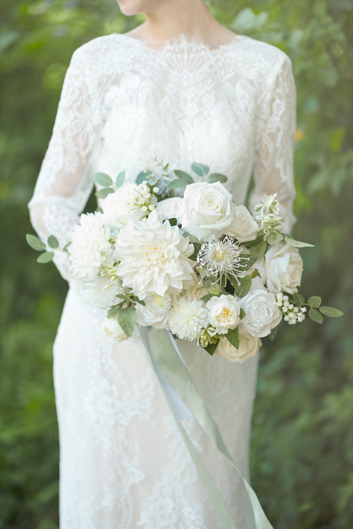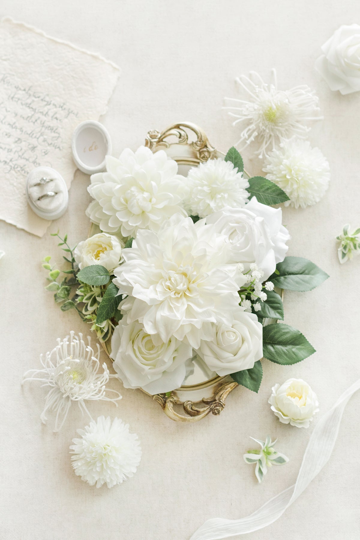 Silk Flowers: ivory semi-cactus dahlia x2 (assorted sizes) . ivory waterlily dahlia x1 . white Vendela rose x2 . ivory Vendela rose x4 . ivory pompons x5 . petite peony x2