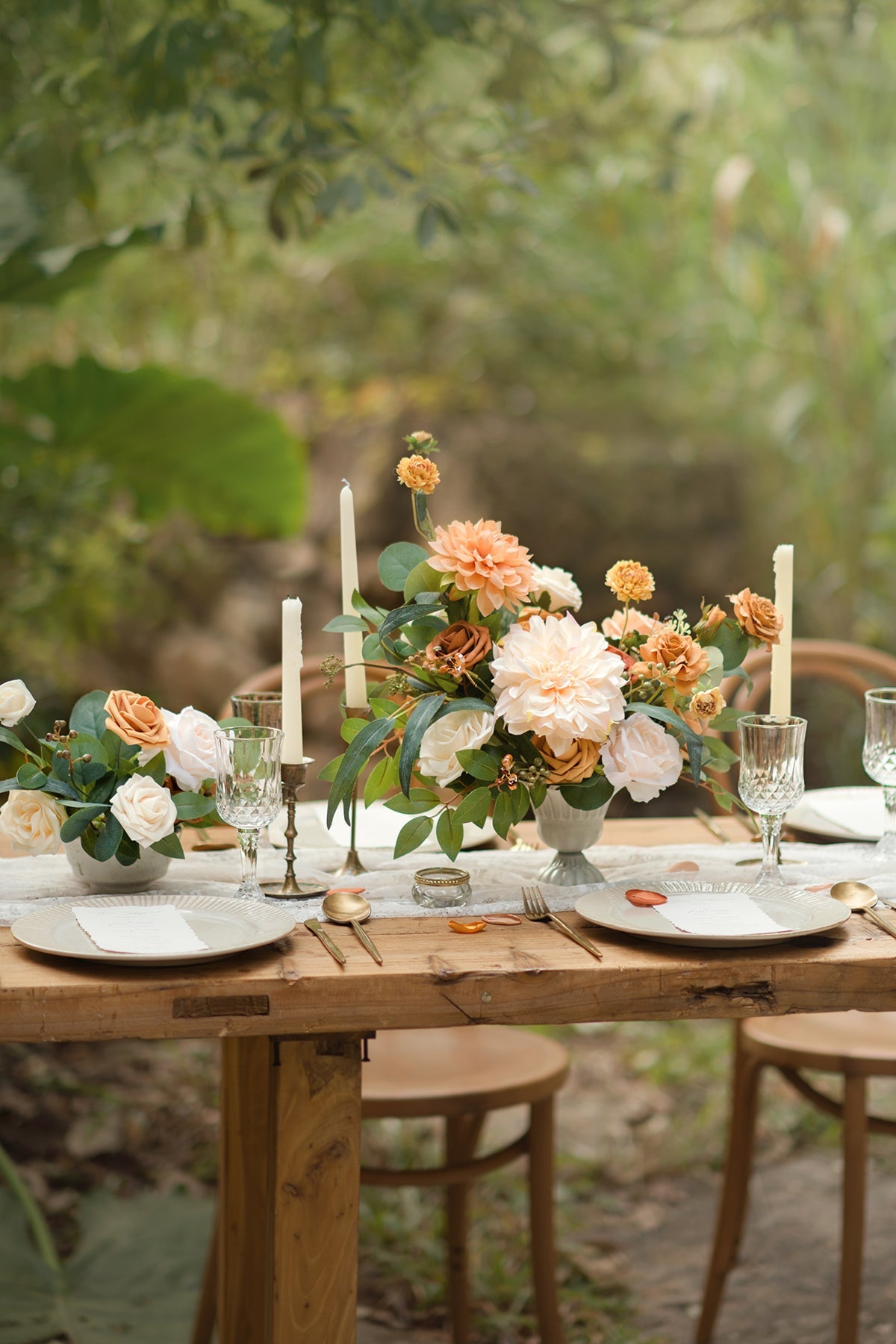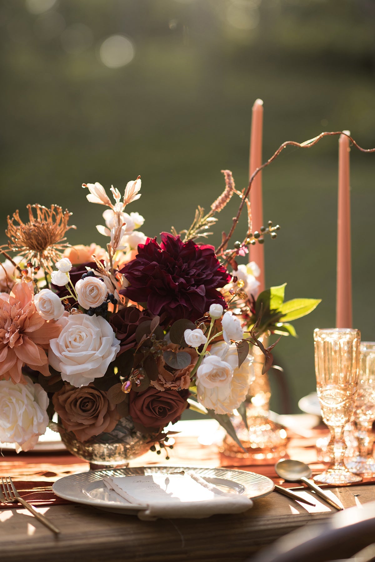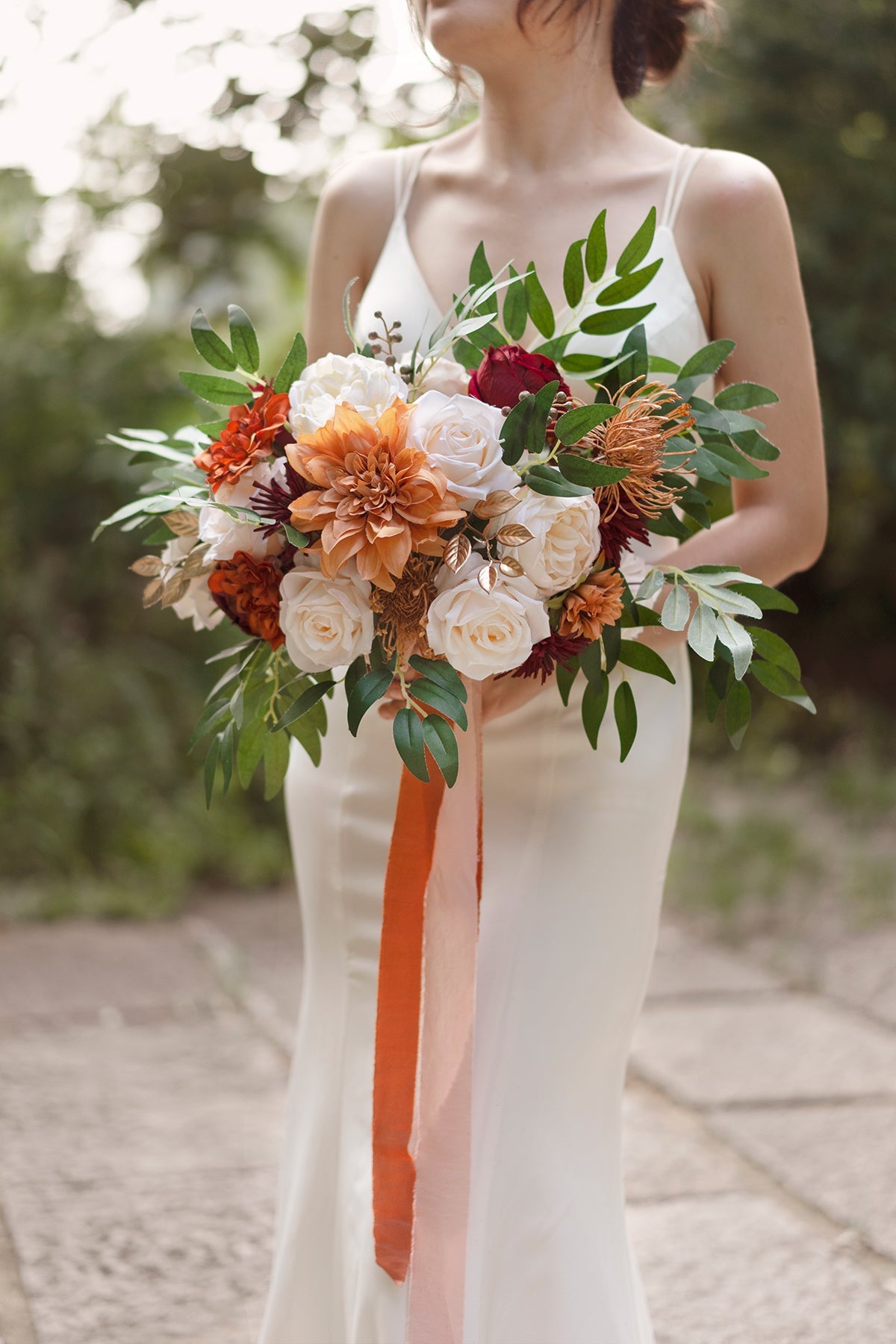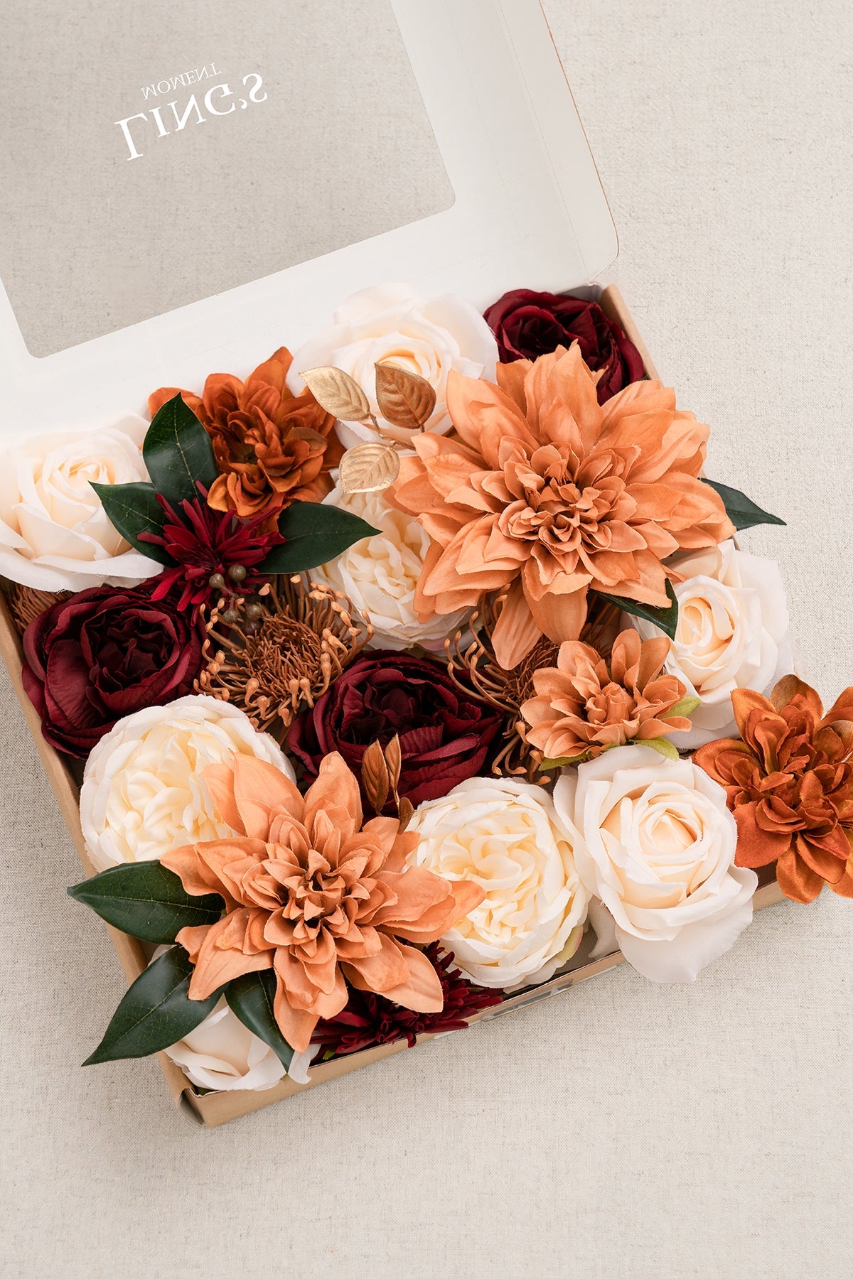 - Silk Flowers: champagne semi-cactus dahlia x1 . light brown waterlily dahlia x1 . cream rose x4 . light brown rose x2 . brown rose x1