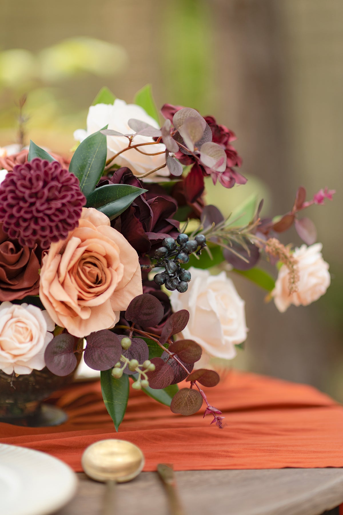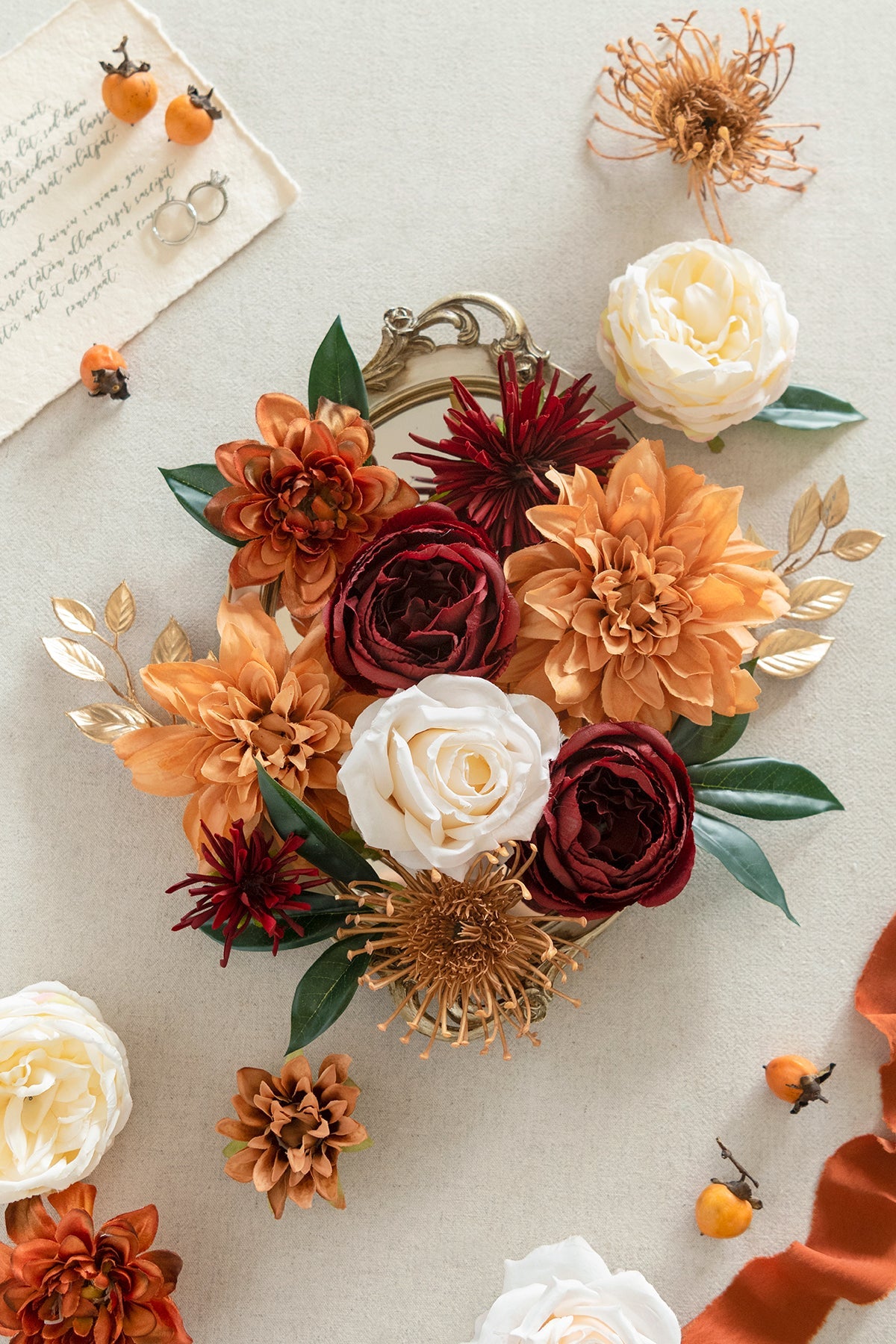 - Silk Flowers: black baccara chorale rose x1 . orange clay Vendela rose x1 . burgundy Vendela rose x3 . black baccara semi-cactus dahlia(assorted size) x2 . orange clay rosebud (assorted size) x2 . orange clay heirloom avalanche rose x2 . cream avalanche rose x1