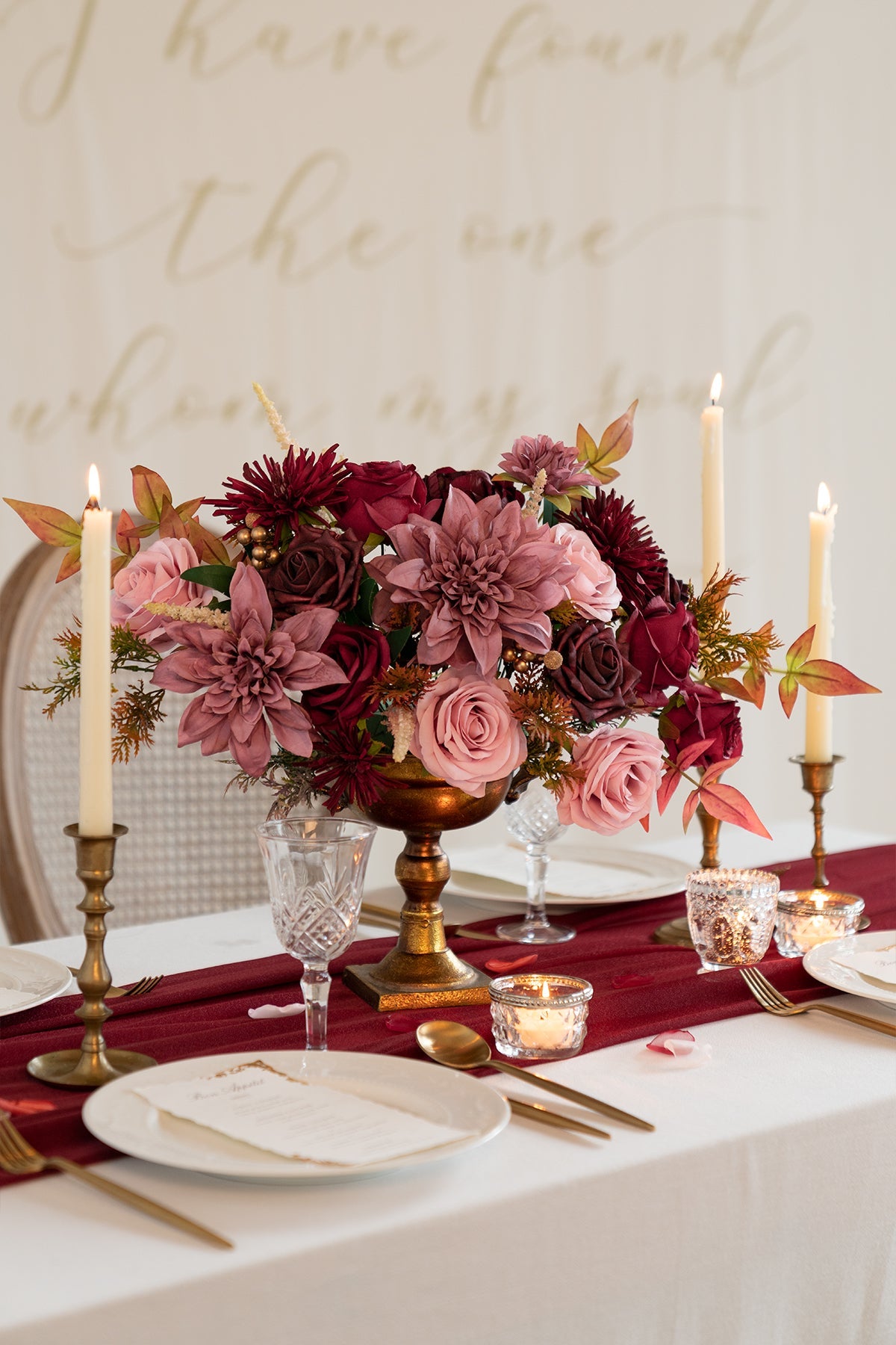 This series flower box set is featured in dahlia . accented with rose . spider mums . peony . and greenery for a sensual . stunning . and truly luxurious feel.