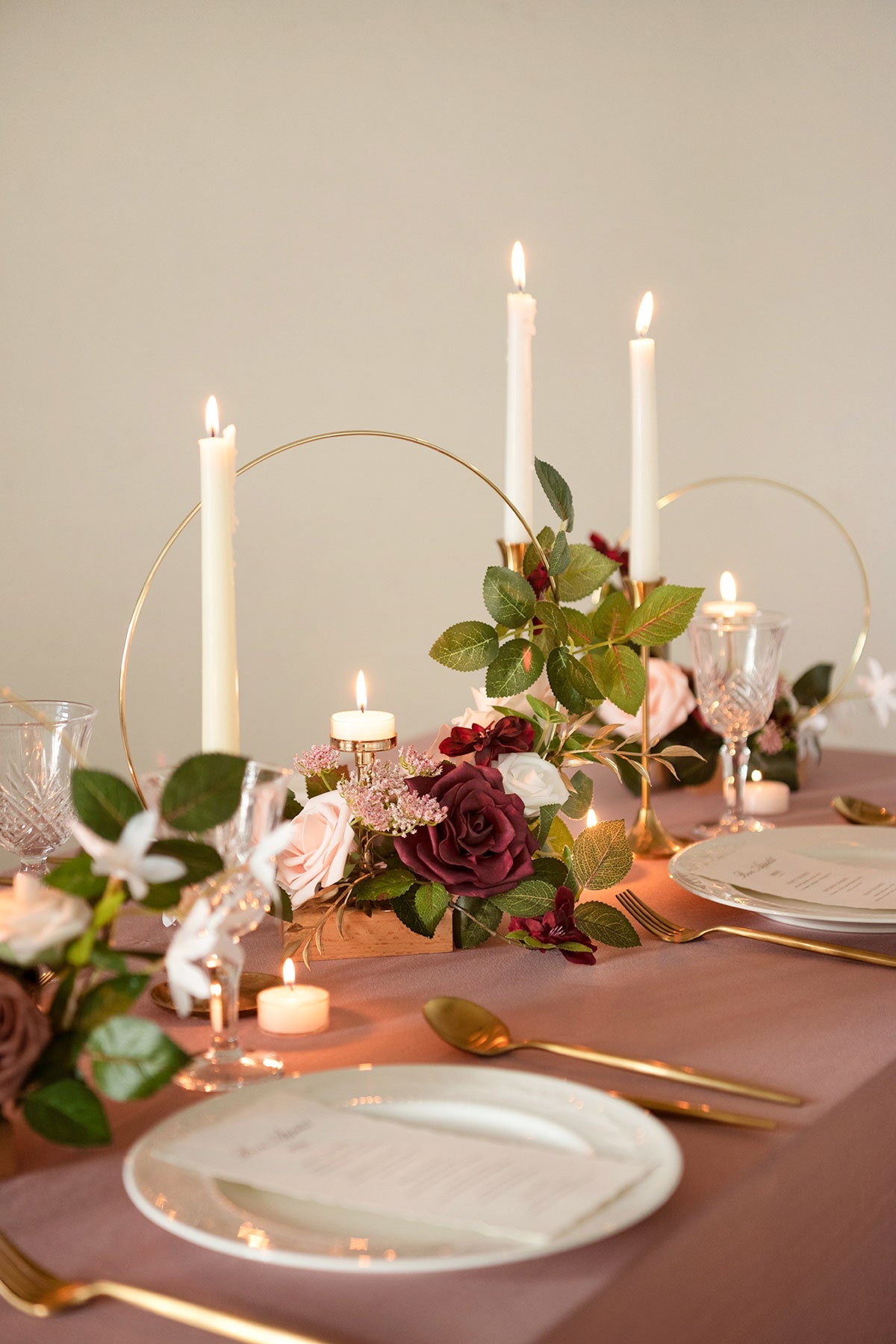 - Material: The holders are made of high-quality gold ring candle holders and wooden bases. The flower arrangements are made of real-looking dusty rose . marsala rose and peony . dotted with little pink flowers and rose leaves.