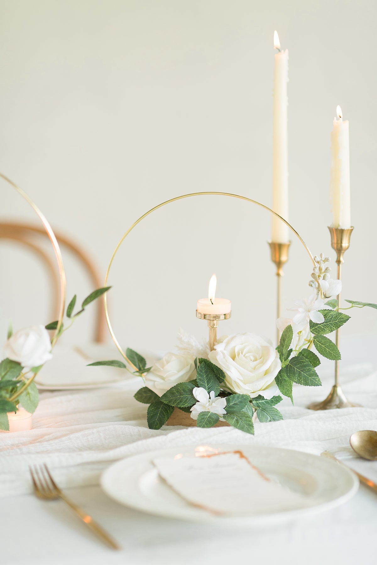 - Material: The flower arrangement is mainly made of silk/foam flowers . including real-looking ivory pony . ivory Escimo rose . ivory rose . white rose . and white delphinium . dotted with some greenery. The holders are made of high-quality gold ring candle holders and wooden bases.