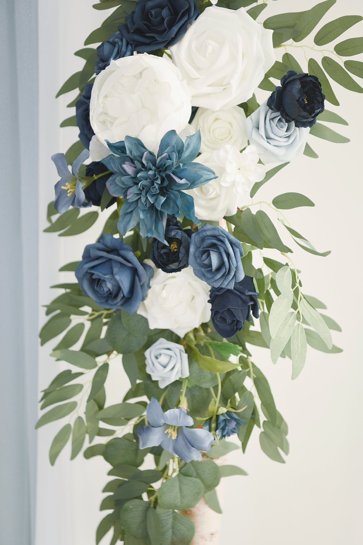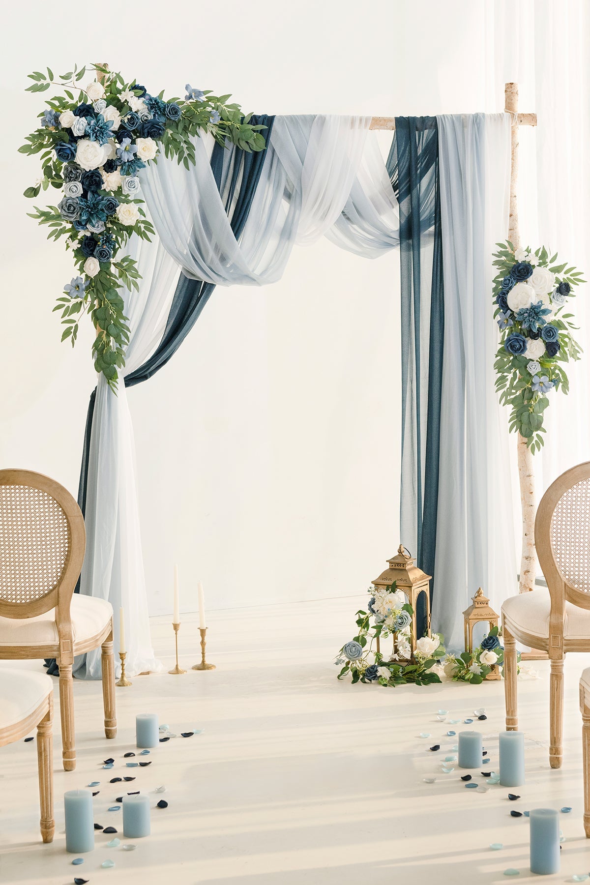 - Package: Set of 5 . including large corner flower swag x1 . tie-back flower x1 . ice blue drape x1 . navy blue drape x1 . white drape x1 . and green cable zip tie x6. Please note: arch stand . candles . candleholders . rose petals . lanterns . and lantern flowers are not included in the package.
