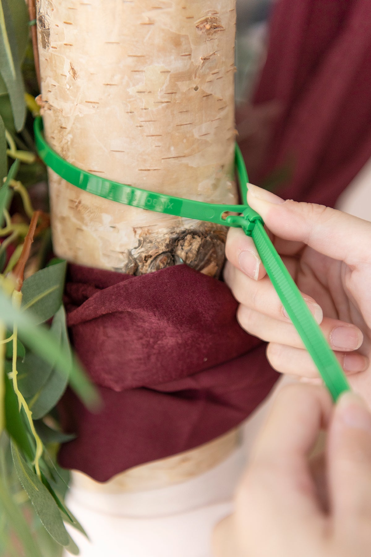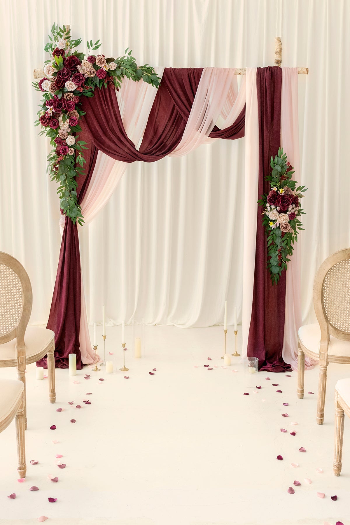 Package: Set of 4 . including corner flower swag x1 . tie-back flower x1 . blush drape x1 . burgundy drape x1 . and green cable zip tie x6. (Wooden arch NOT included.)
