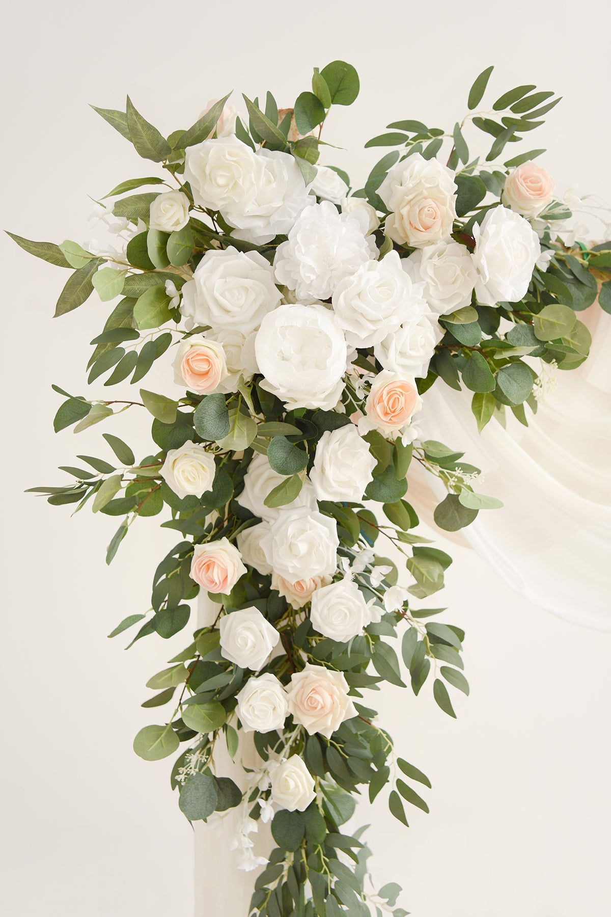 Material: Mainly made of foam/silk flowers in colors of white . ivory . blush heirloom . peach heirloom . silk/plastic greenery . and chiffon drapes. Silk flowers include Vendela rose . open rose . and peony. Foam flowers include rose . avalanche rose . hybrid tea rose . and high-centered rose . with some accessories like willow eucalyptus garland and filler spray flowers.