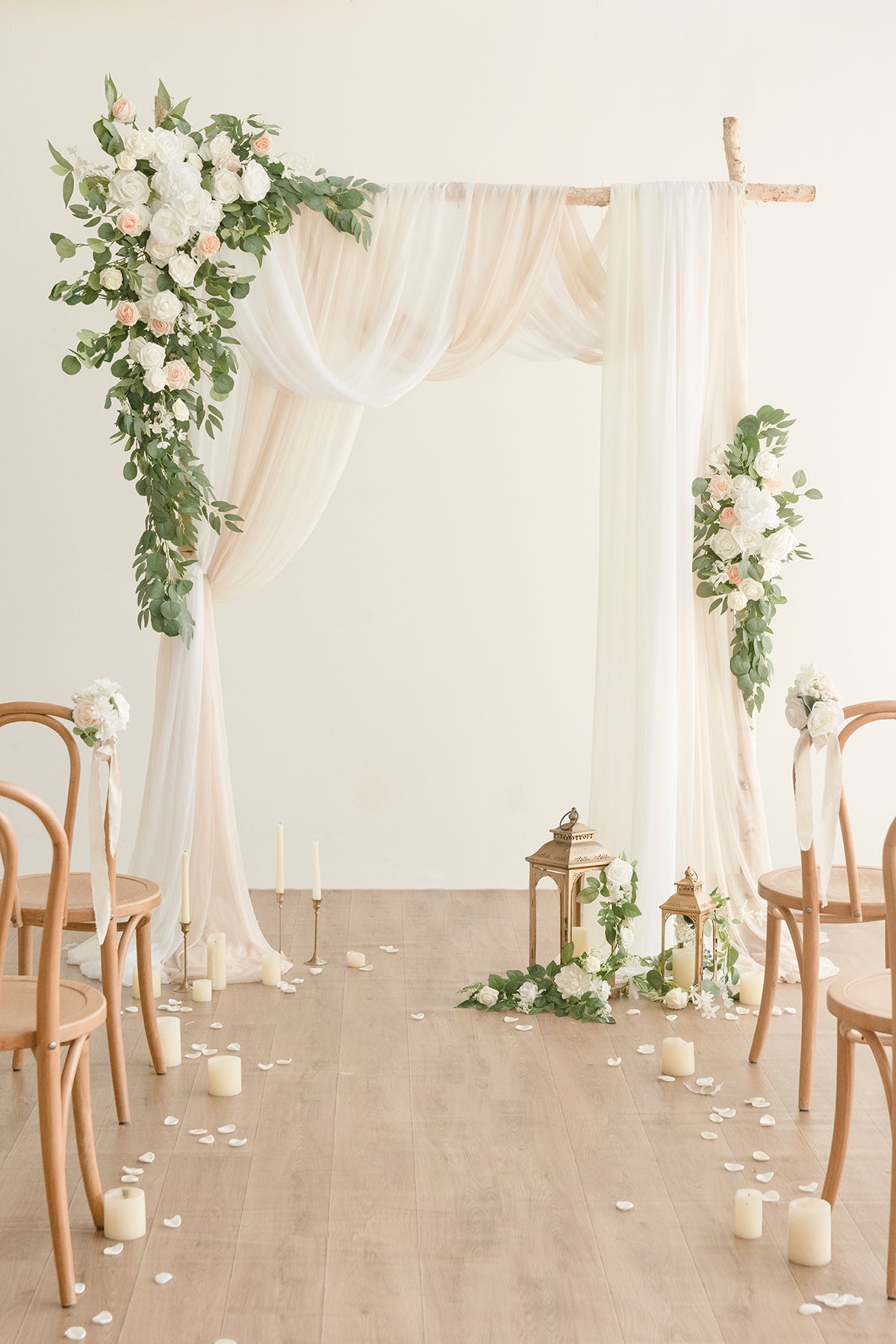 Package: Set of 4 . including large corner flower swag x1 . tie-back flower x1 . white sheer drape x1 . ivory sheer drape x1 . and green zip ties x6. Please note: arch stand . candles . candleholders . rose petals . lanterns . and lantern flowers are not included in the package.