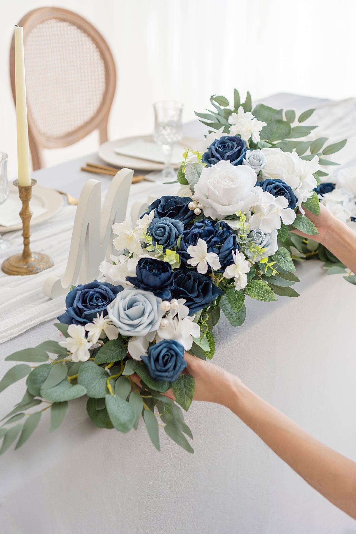 - Materials: These flower arrangements were made with silk flowers and foam flowers. Including powder blue rose . dutch blue rose . navy blue rose . white rose . navy blue avalanche rose . white rose . white ranunculus . mini white flower . navy blue mini peony . filling with white pearl . mini eucalyptus branch flocked lambs ear leaves . rose leaves . willow leaves.