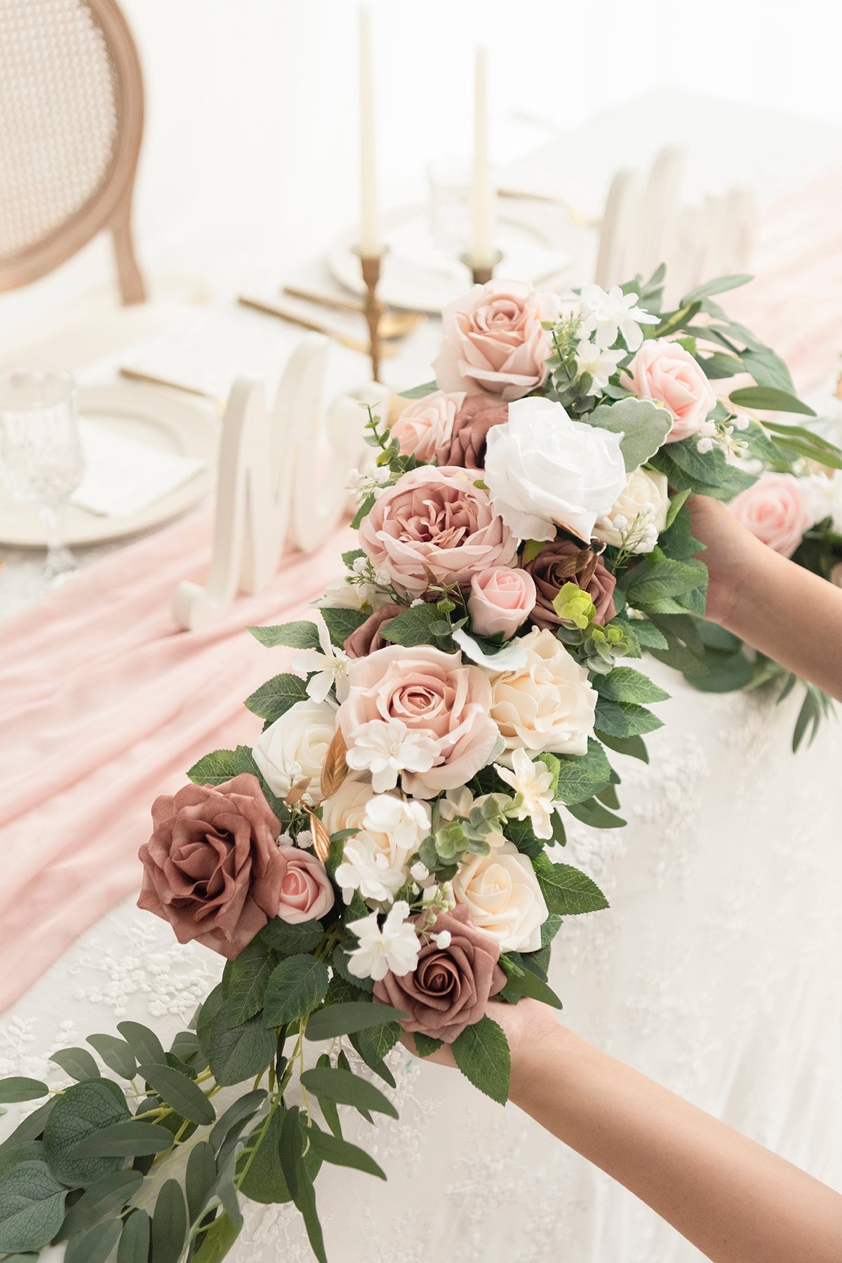 - Materials: These flower arrangements were made with silk flowers and foam flowers. Including dusty rose . white and cream rose . willow leaves . eucalyptus . and gold floral picks to create a romantic dusty rose color scheme.