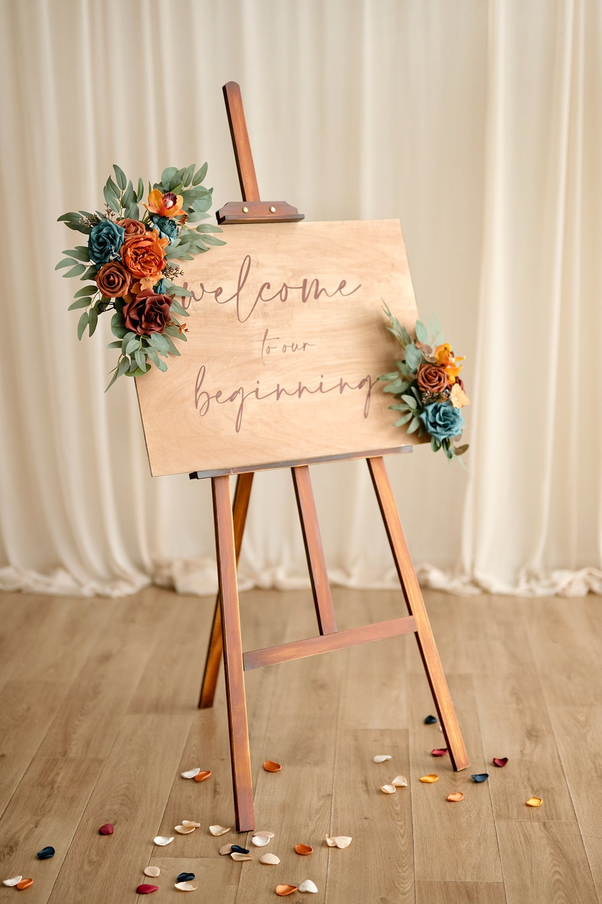 - Material: Handmade item . flower swag made of artificial burnt orange rose . emerald rose . amber rose . teal green avalanche rose . amber avalanche rose . teal green rose . filled with mandarine magnolias . burnt orange hydrangeas . burgundy seeded branch . bronze gold leaf . and gold sparrow eucalyptus. Come with cable zip ties and metal clips.