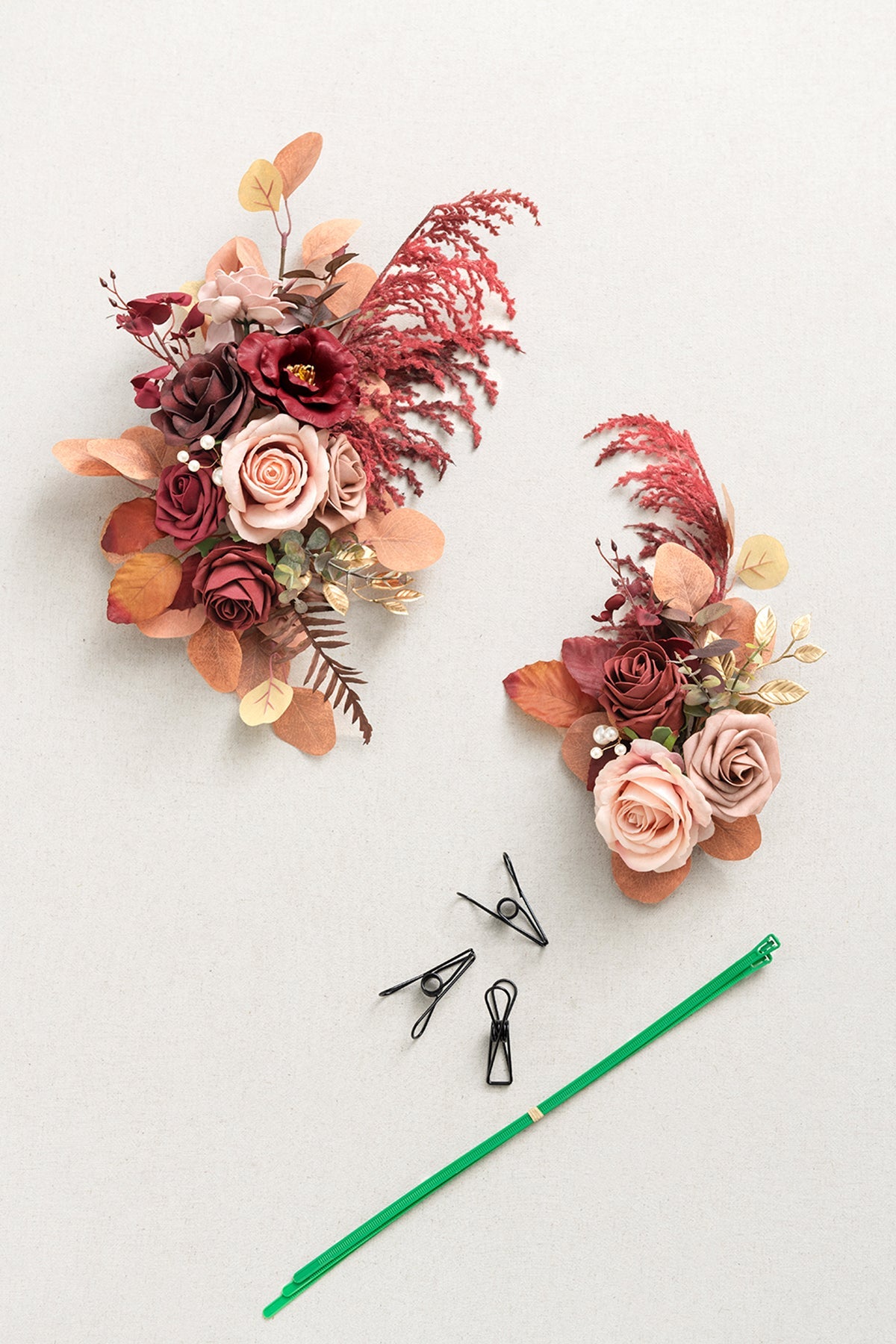 Material: Beautiful and real-looking burgundy foam rose . burgundy high-centered rose . dusty rose gardenia . black baccara avalanche rose and pink silk rose . burgundy latex camellia with black baccara dancing orchid flowers and gold . dusty lilac . burgundy eucalyptus leaves dotted burgundy reed decoration.