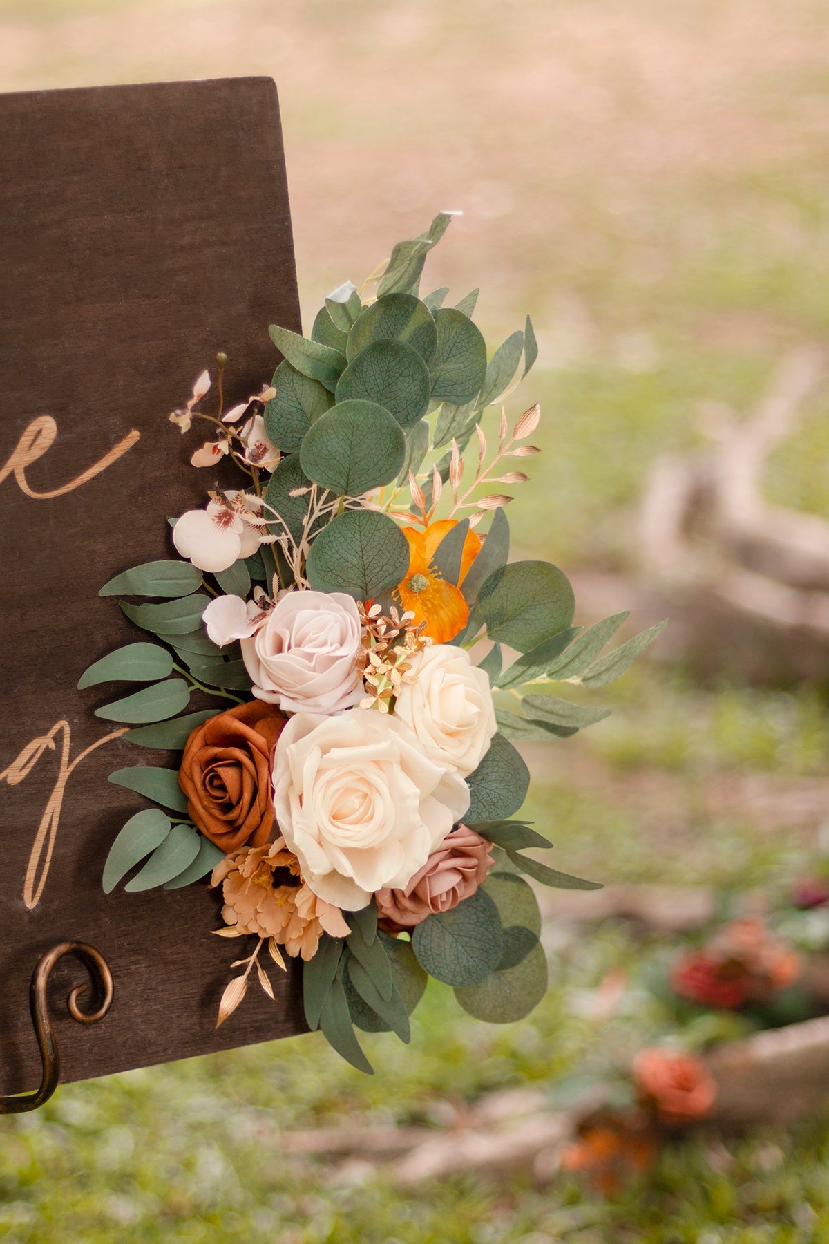 - Material: Handmade item . flower swag made of artificial burnt orange and dusty rose . cream rose . peony . small rose bud flowers add eucalyptus and willow greenery garland . artificial pomegranate spray . and filler spray flower decoration. Come with cable zip ties and metal clips.