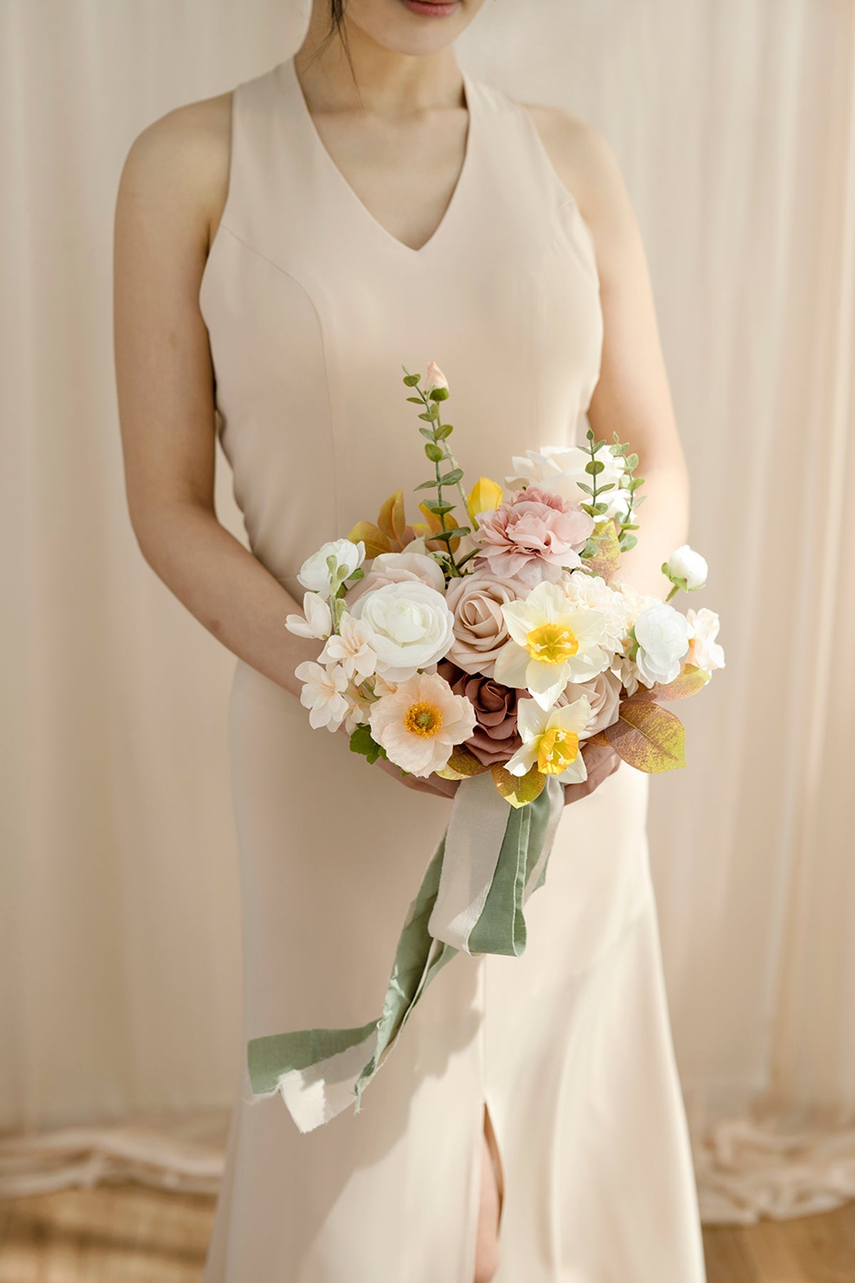 - Silk flowers include yellow Daffodils . champagne delphinium . blush carnation . nude Vendela rose . white ranunculus . and champagne poppy.