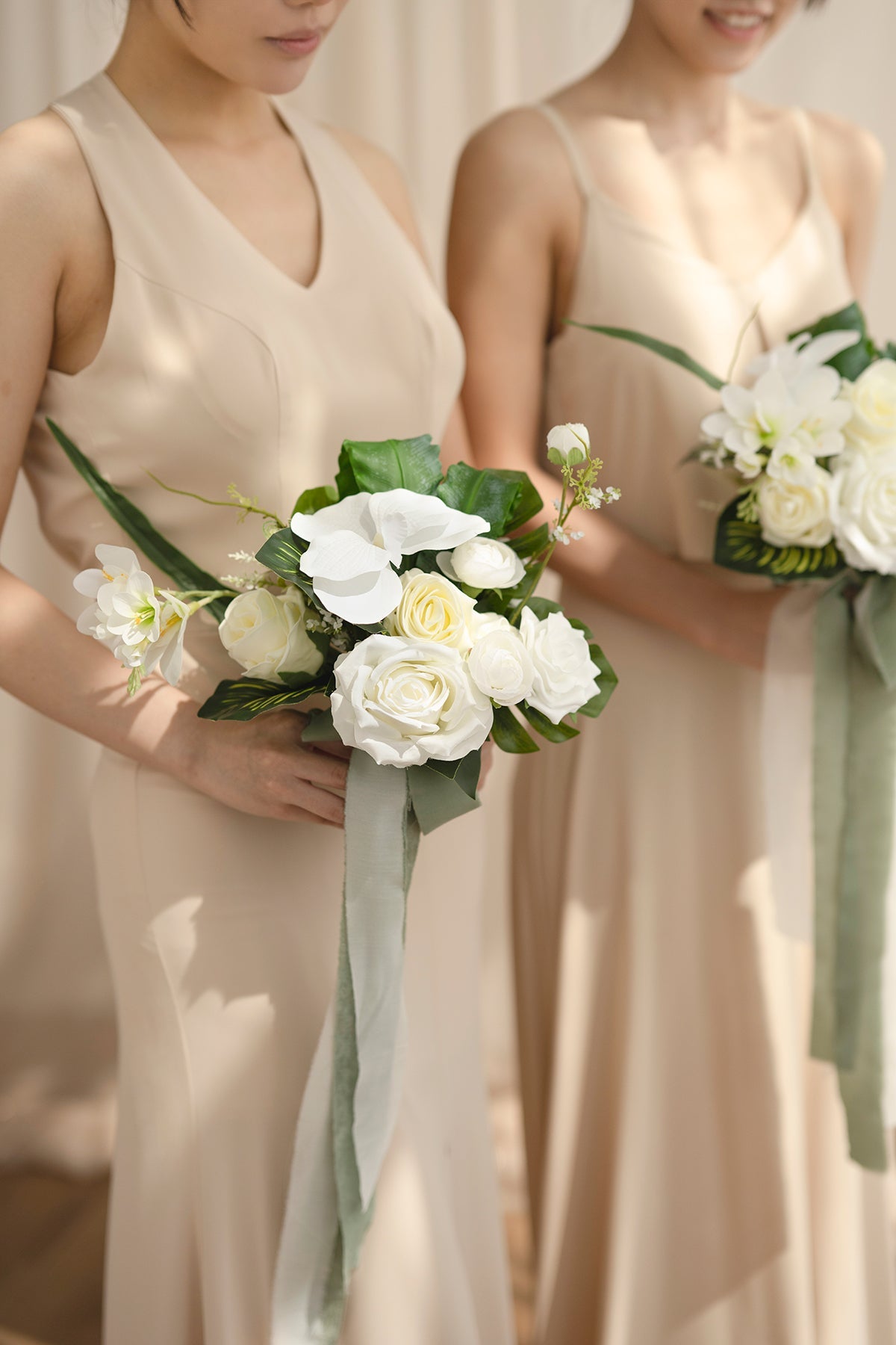 - Size: Each bridesmaid bouquet is approx. 7" W x 13" H. The ribbons: each piece is 1.5" W x 5ft L . 4 pieces each in sage green and white.