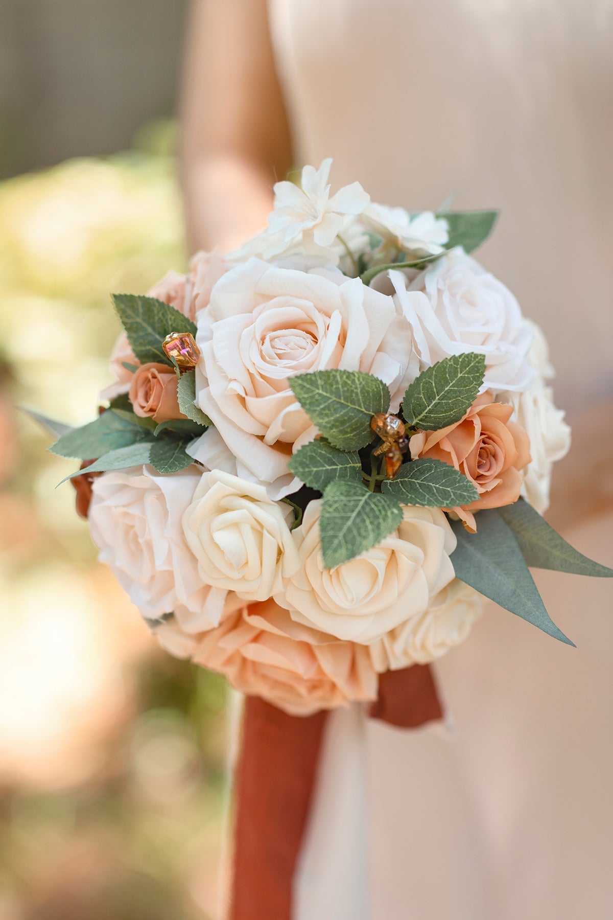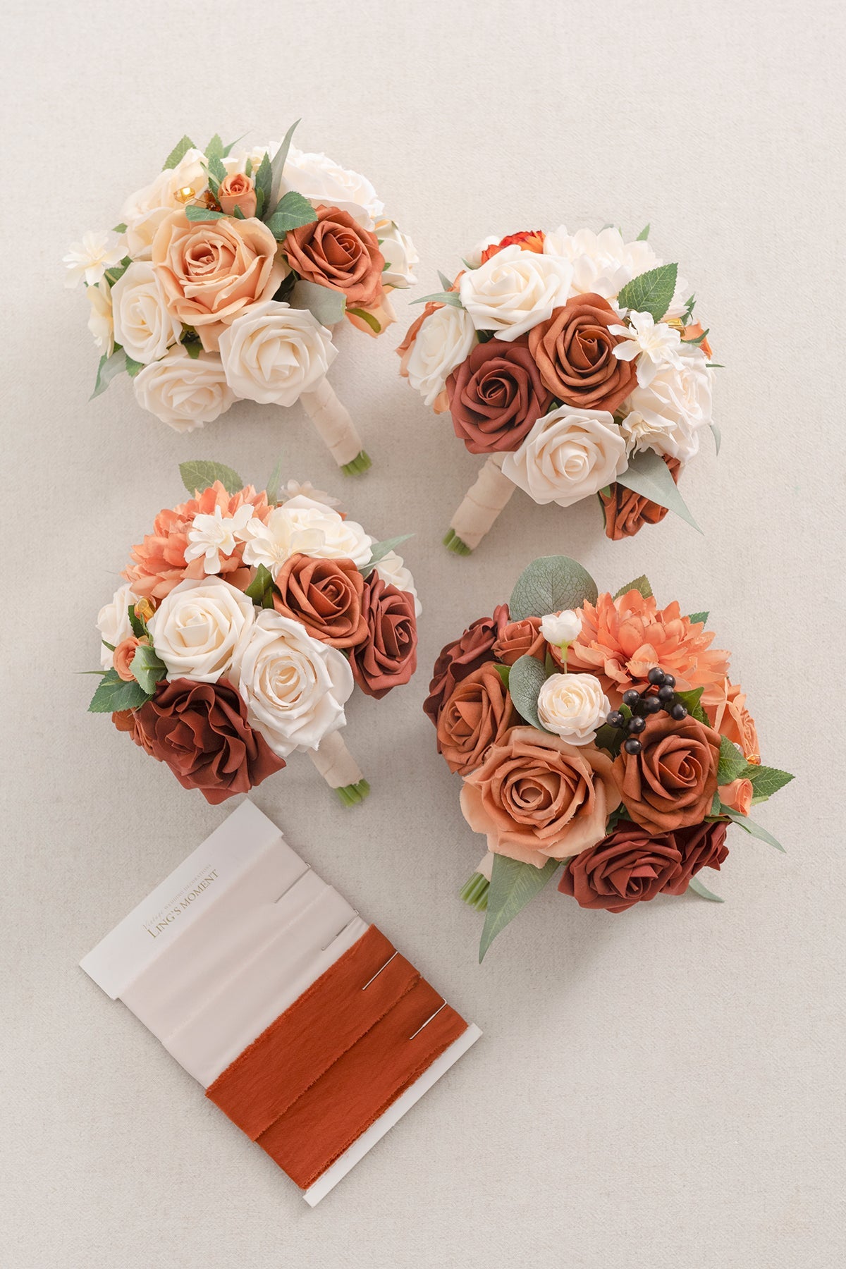 - Package: 7-inch gradual bridesmaid bouquet . set of 4. The design inspiration comes from the ever-changing color matching of nature . so each bouquet of flowers has a different color matching ratio . from brunt orange to white . which is both different and a series. Each bouquet is attached with 4.5ft long x 5" wide terracotta chiffon ribbon and cream chiffon ribbon.