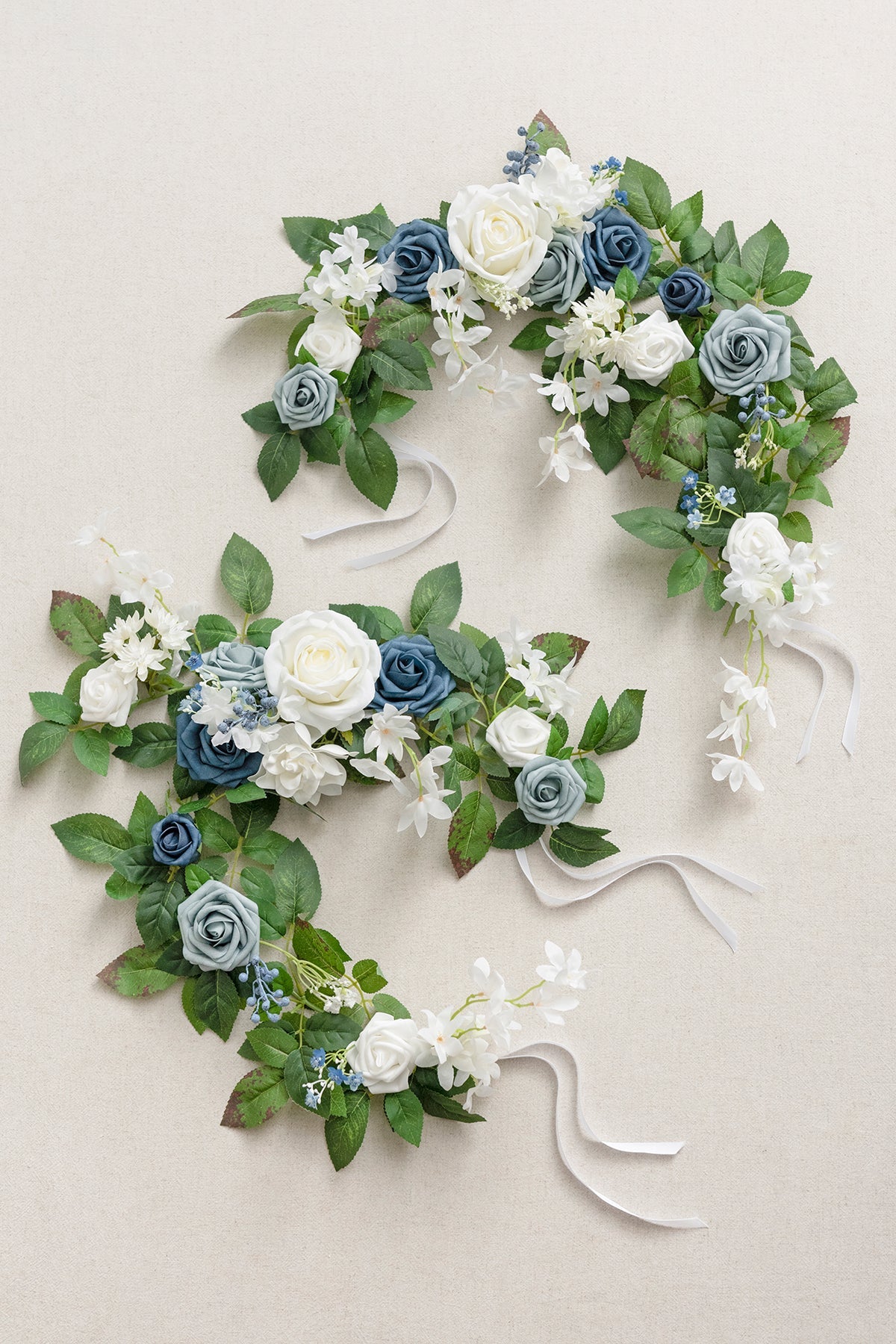 - Material: This aisle flower garland decor is made with silk and foam handcrafted flowers. Including powder blue rose . dutch blue rose . white avalanche rose . blue baby's breath and realistic rose leave garland.