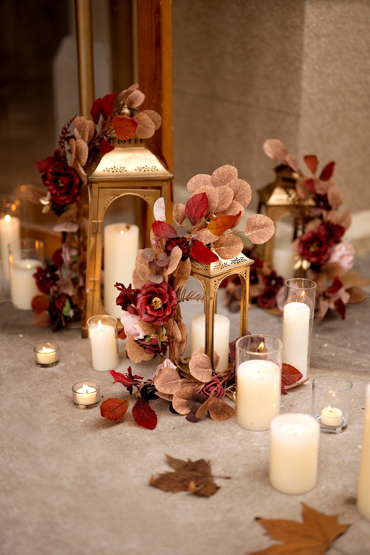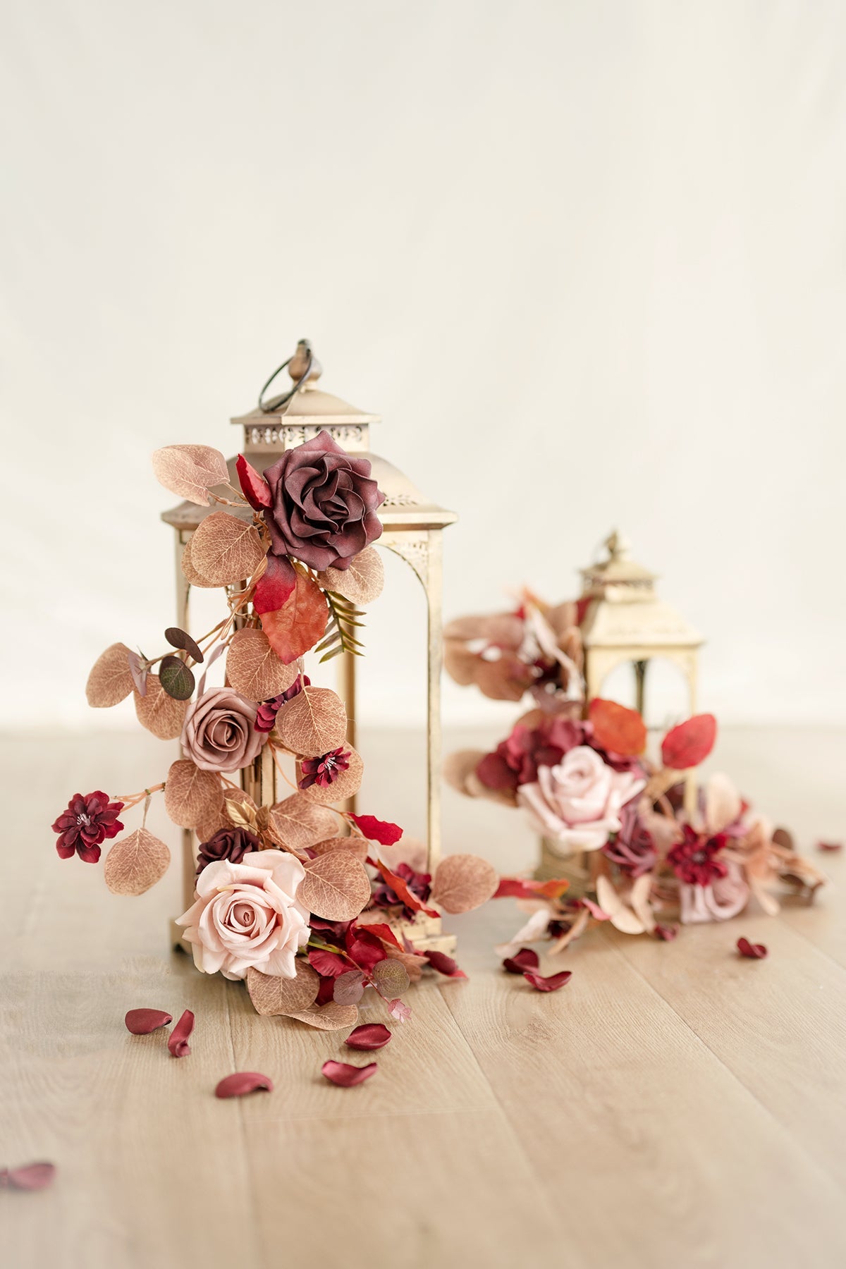 Material: This aisle flower garland decor is made with silk and foam handcrafted flowers. Including burgundy camelia . marsala rose . dusty rose rose . burgundy mini flower branch . black baccara eucalyptus . burgundy grass branch . golden leaves . and realistic rose leave garland.
