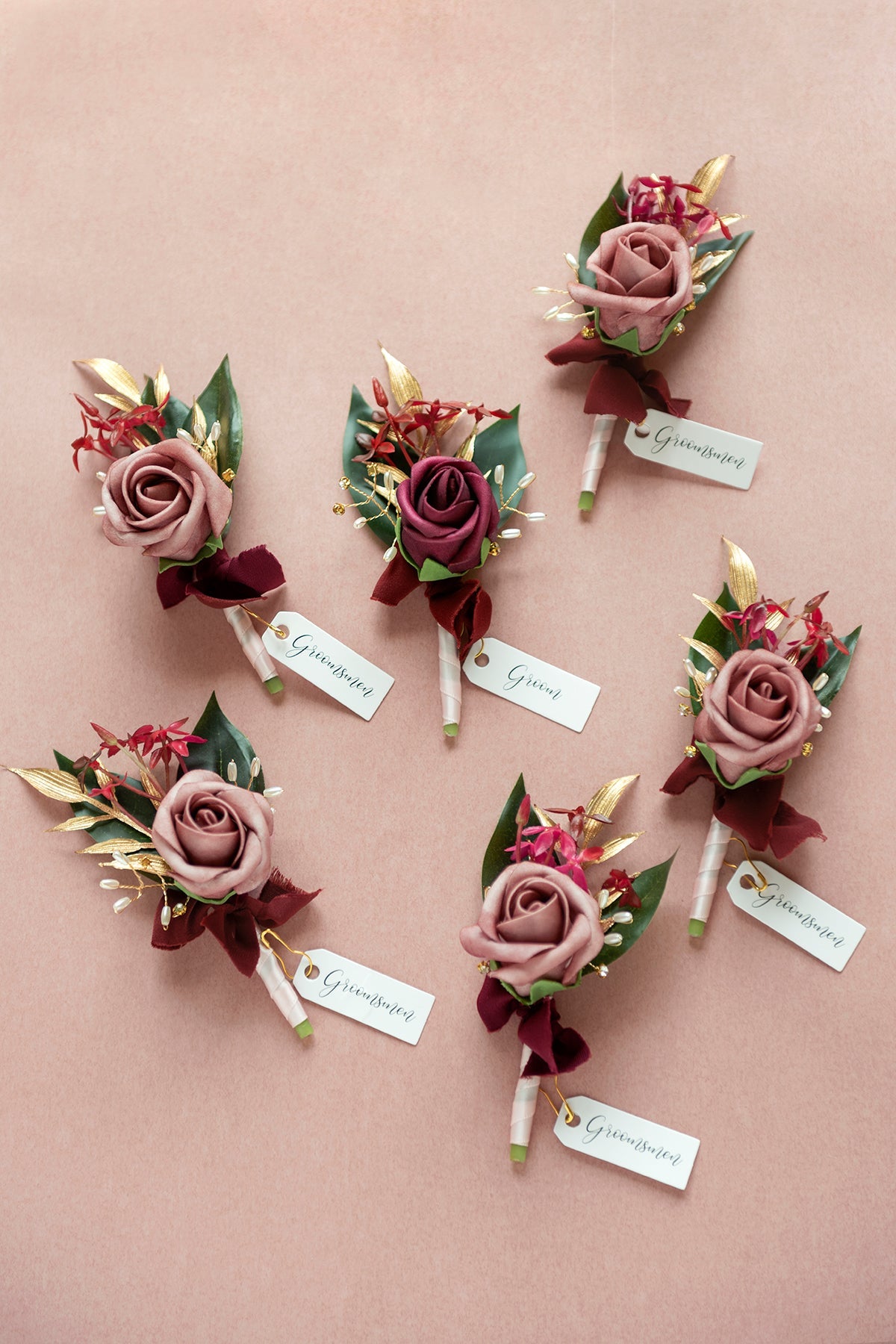 - Package: A set of 6 boutonnieres. 1 marsala color and 5 dusty rose colors. The exquisite and vintage marsala boutonniere may stand out to the groom.